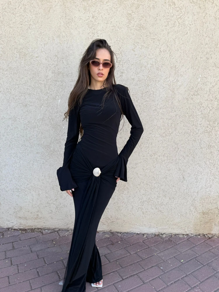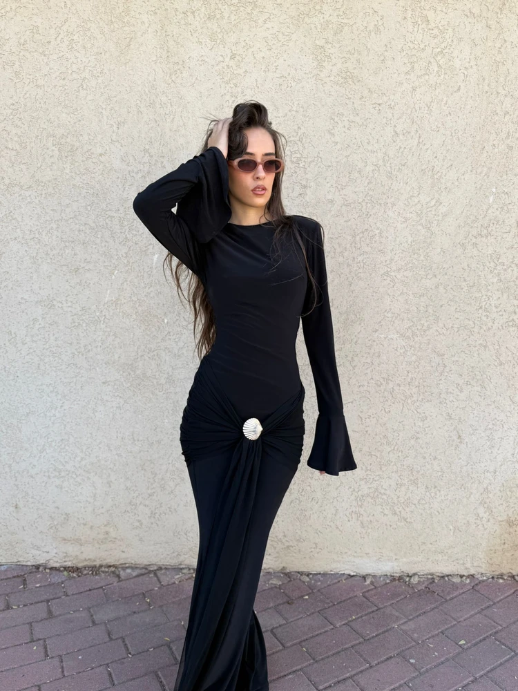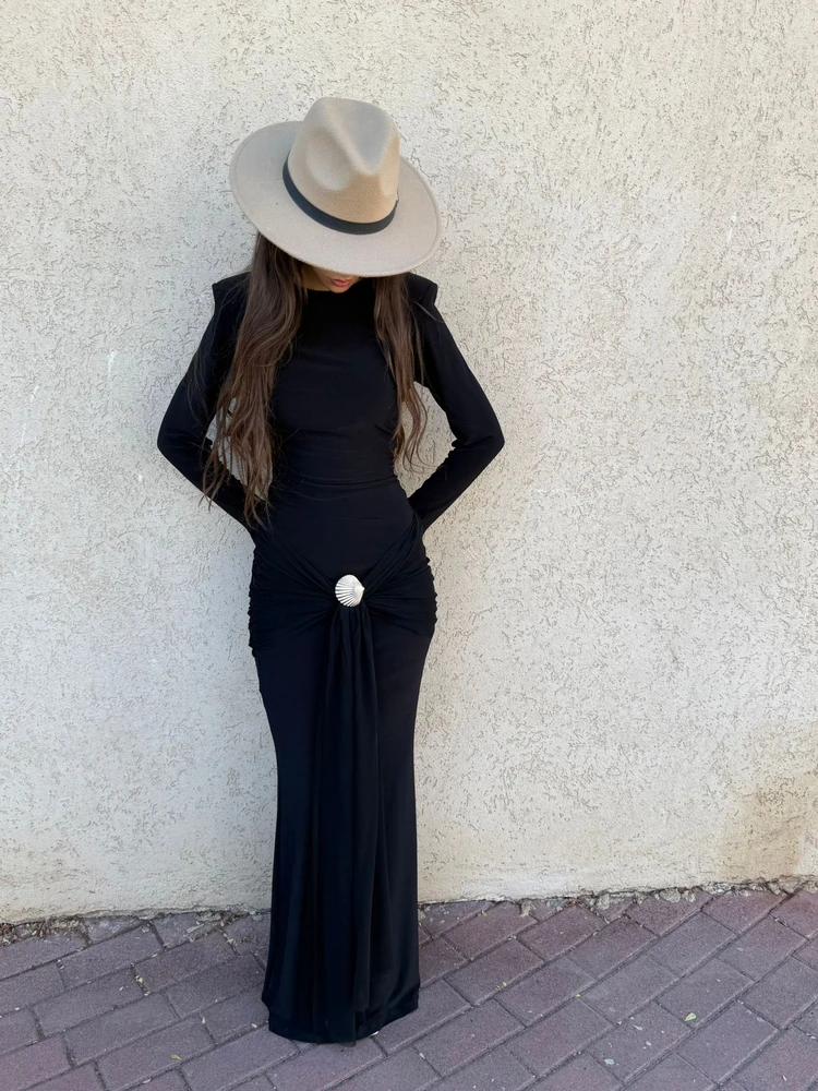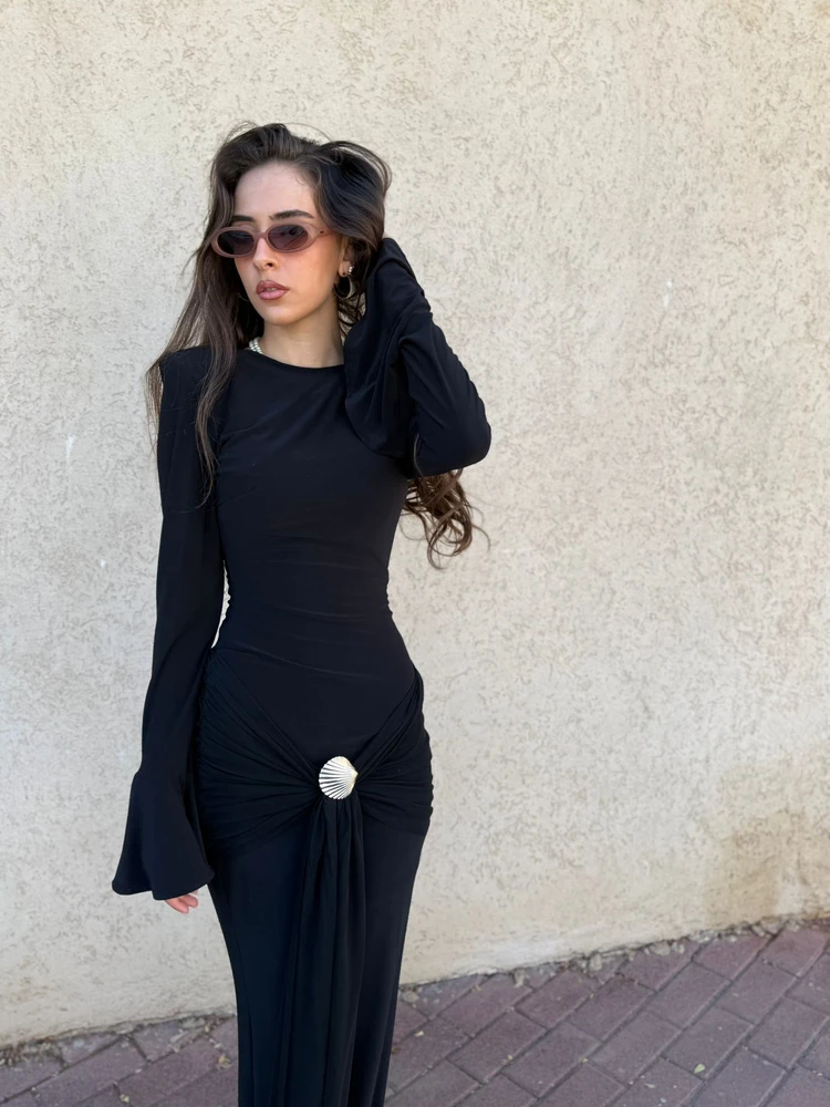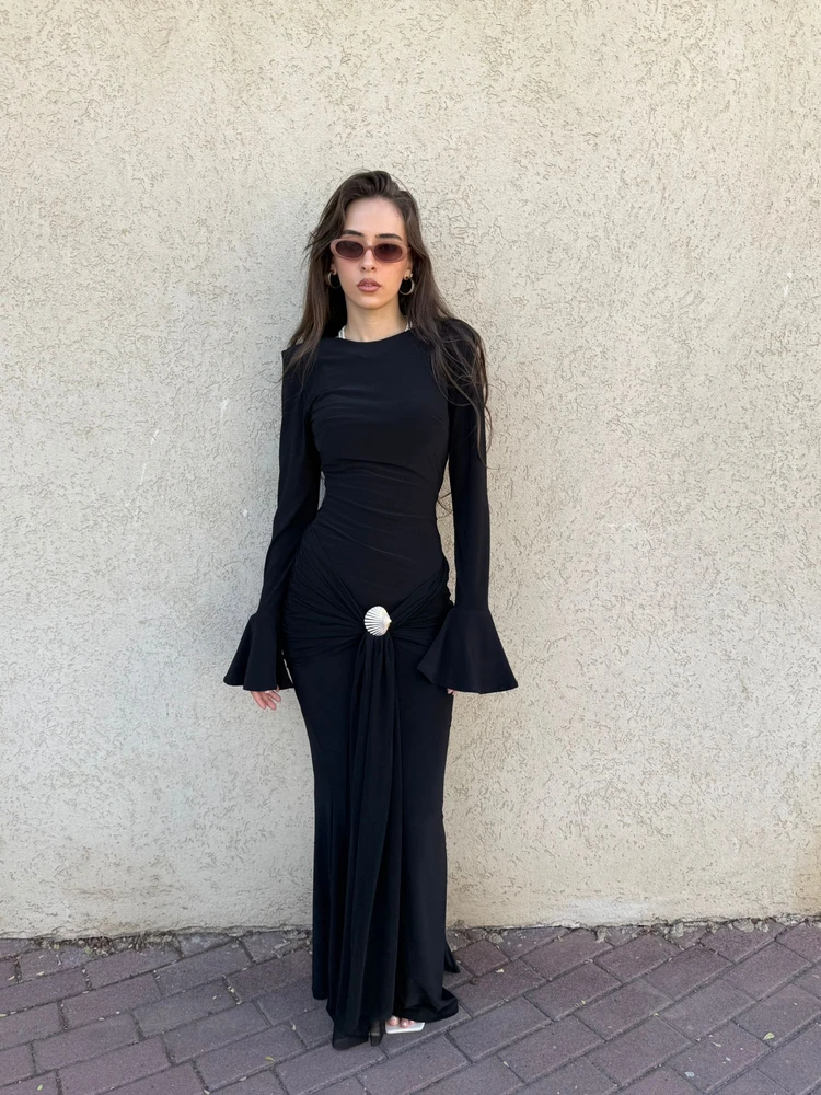 שמלת רומי מבד לייקרה בשילוב קשירת שיפון ואבזם צדפה , סגורה בגב ברוכסן נסתר ,
