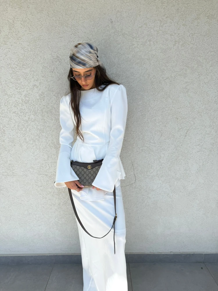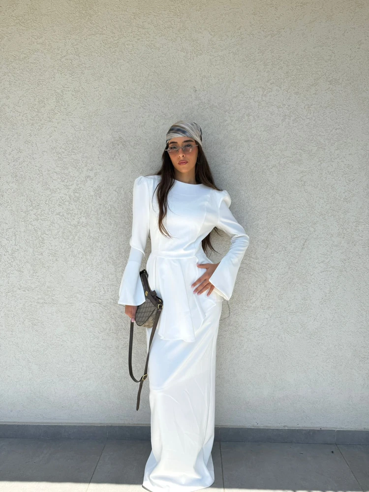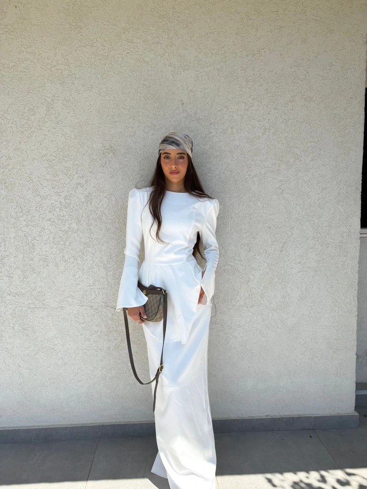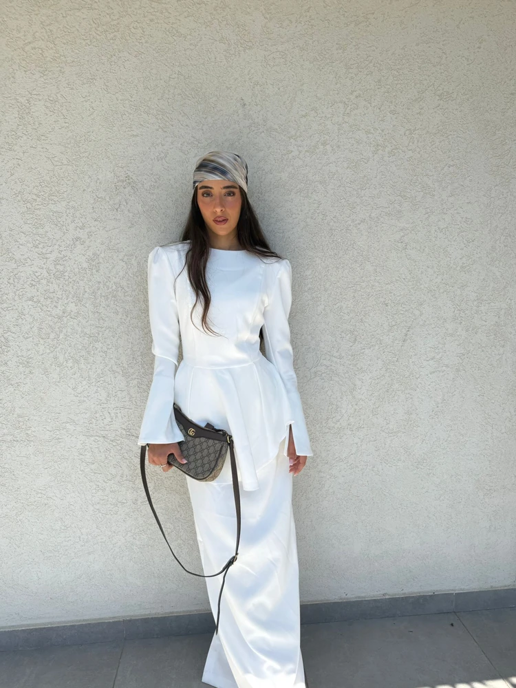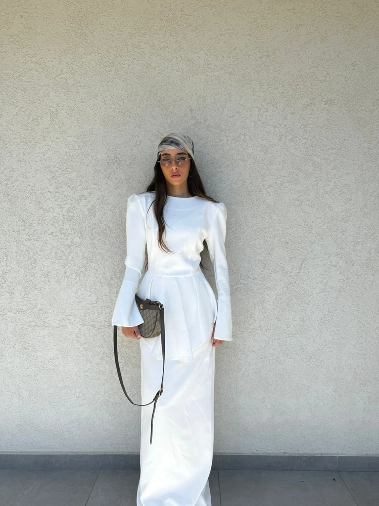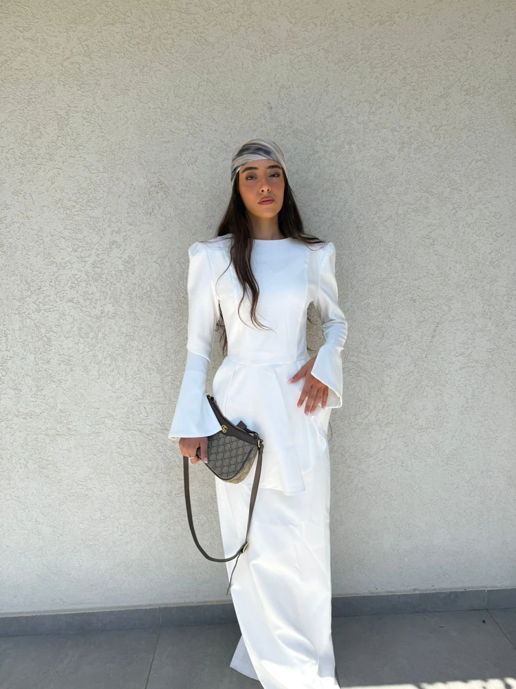 שרוולים ארוכים עם כתפיים מובלטות בגזרה מחויטת, חיתוכים מחמיאים באזור המותן וגימור א-סימטרי בחלק העליון שמוסיף עניין וסטייל ייחודי.