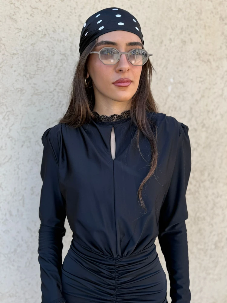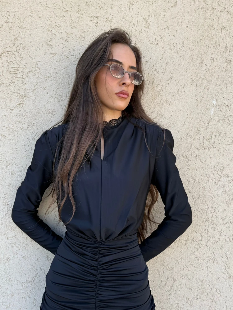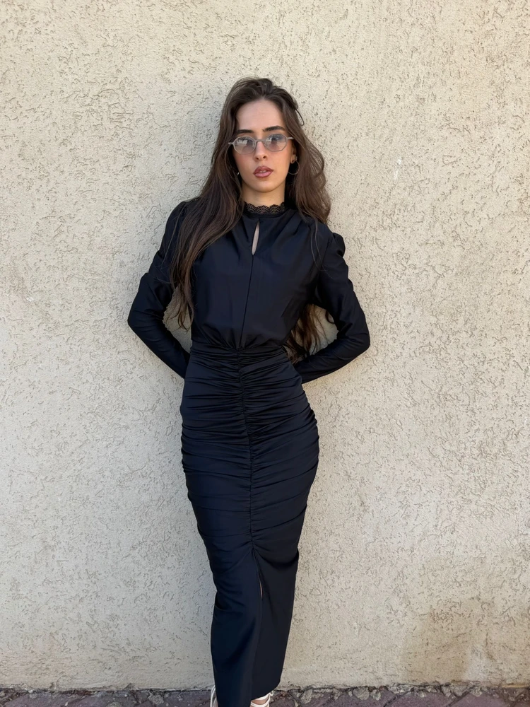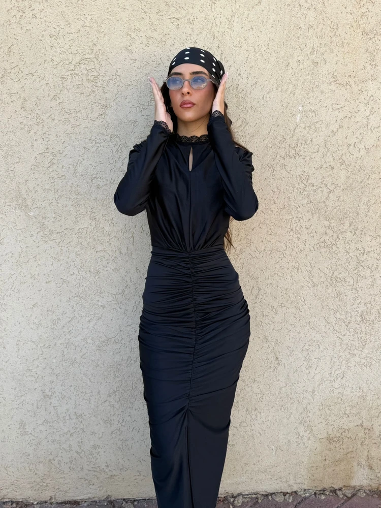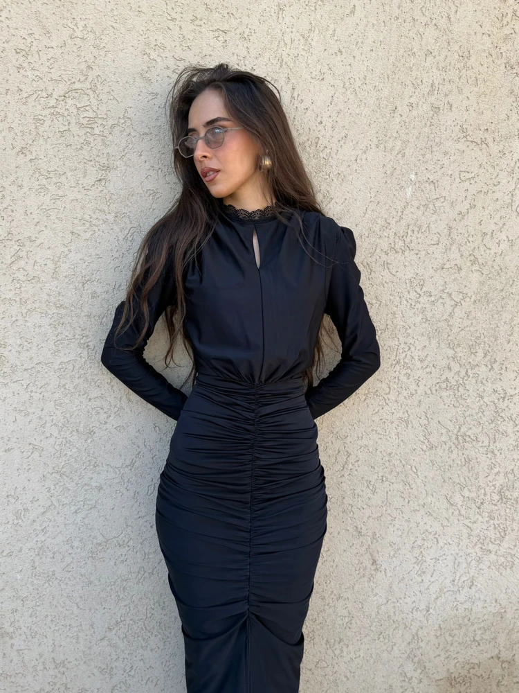 שמלת קטיה מבד קריסטל לייקרה בכיווצים מיוחדים ומחטבת את הגוף משולבת תחרה