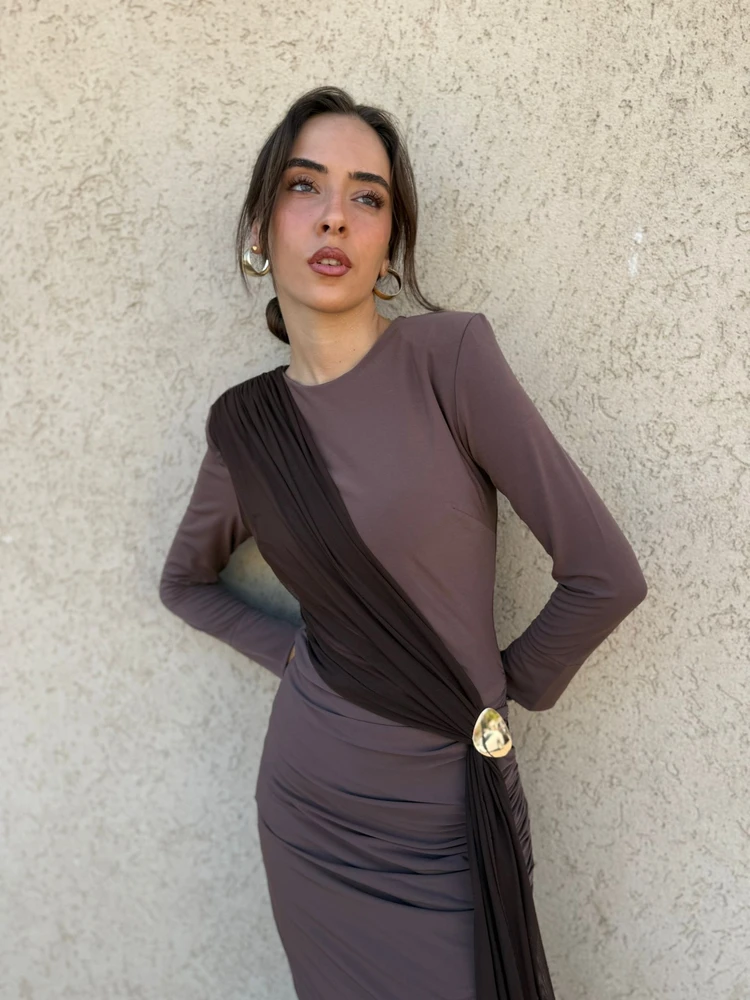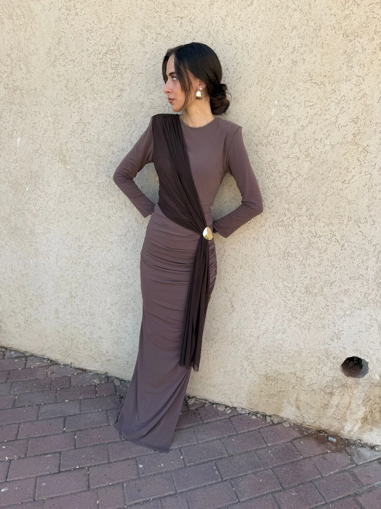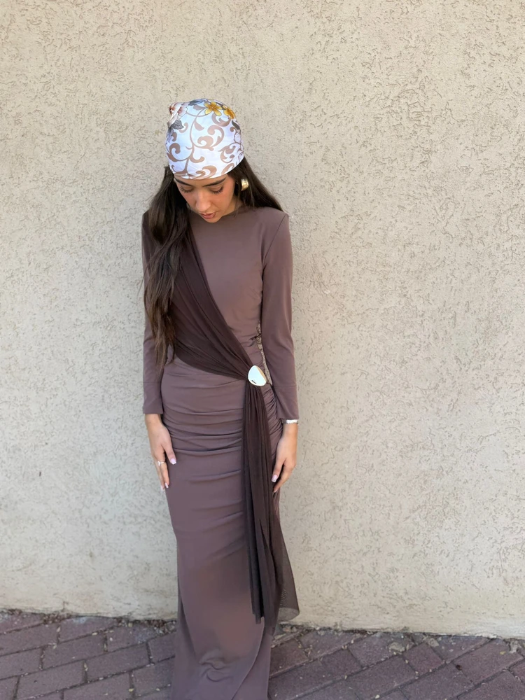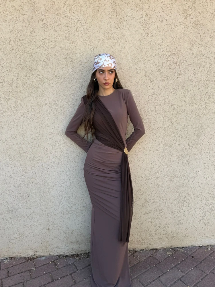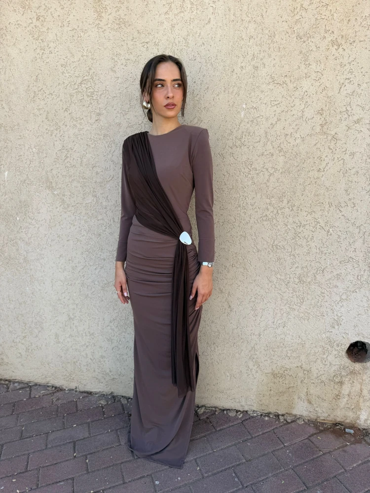 שמלת ערב מקסי צנועה בעיצוב מרשים עם כיווץ אלכסוני הנשפך על הגוף ונאסף בטבעת מטאלית אלגנטית במותן.