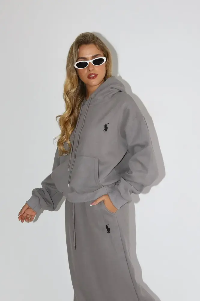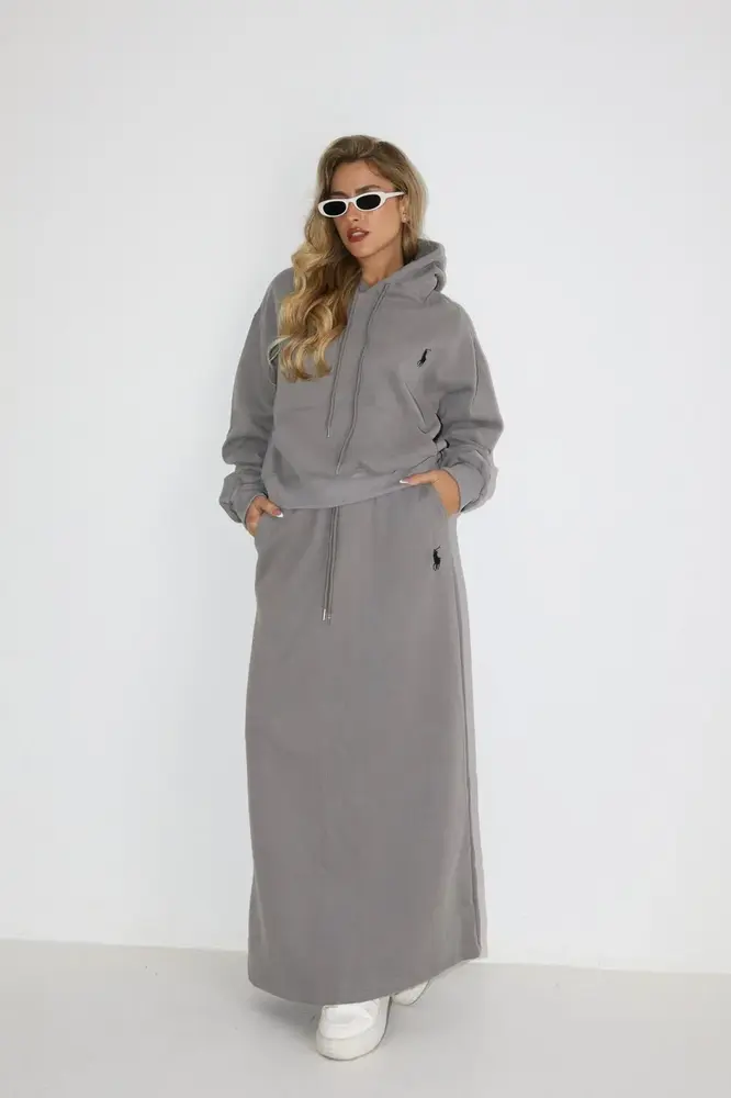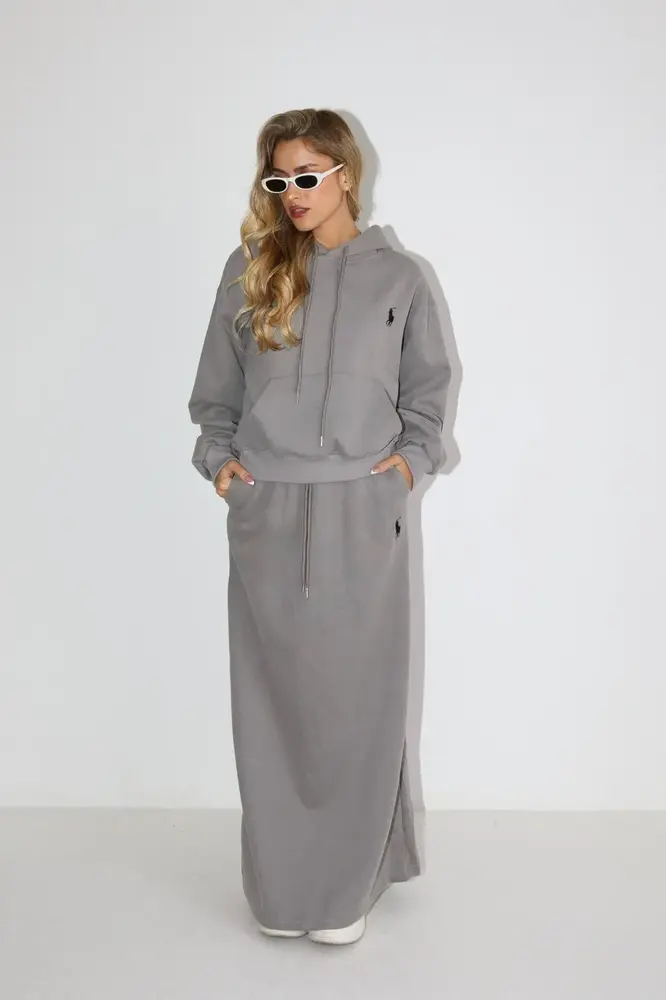 חליפת שני חלקים, חולצת קפוצ׳ון וחצאית ארוכה עם גומי. מידת הבגד על הדוגמנית וואן סייז.