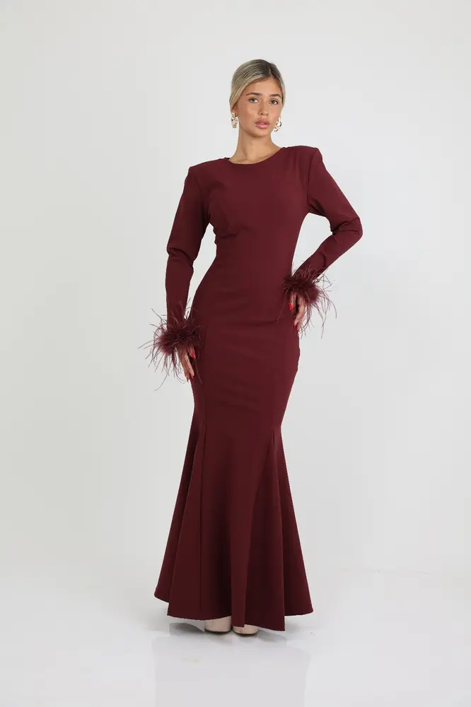 שמלה מבד מחטב דגם קלאסי מיוחד עם שילוב  פרווה ביד