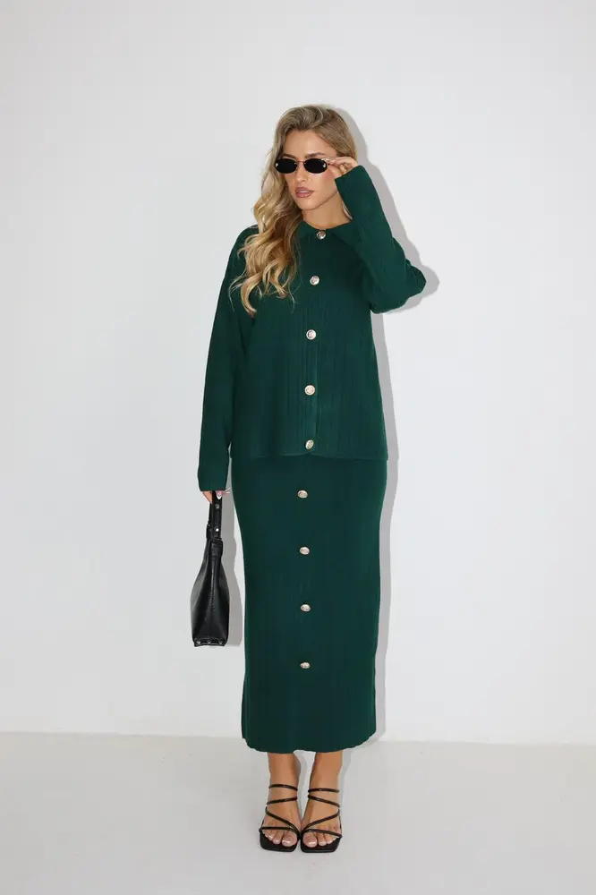 חליפת שתי חלקים מבד סריג נעים על הגוף עם כפתורי בצבע זהב בגזרה ישרה ומחמיאה לגוף