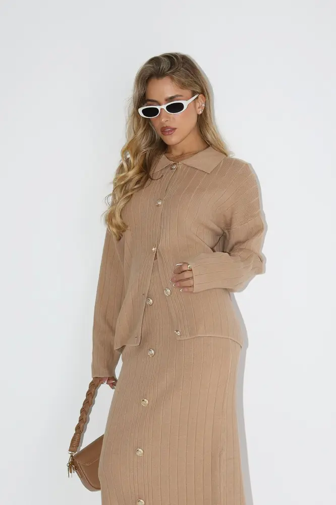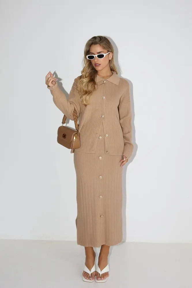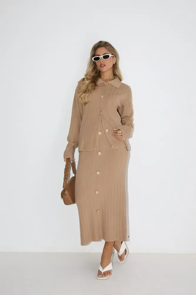 חליפת שתי חלקים מבד סריג נעים על הגוף עם כפתורי בצבע זהב בגזרה ישרה ומחמיאה לגוף