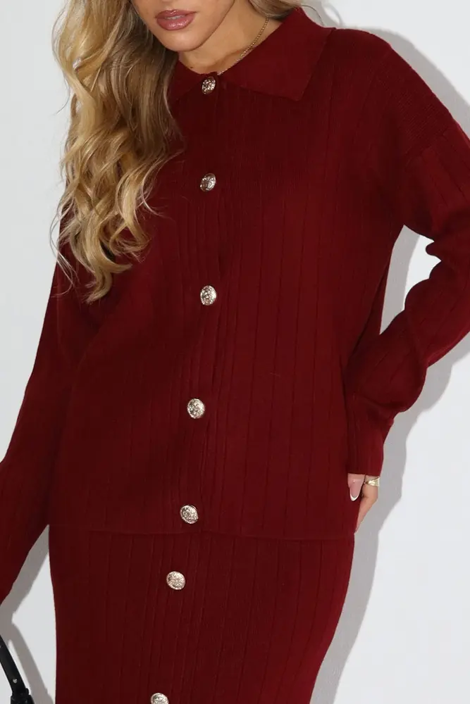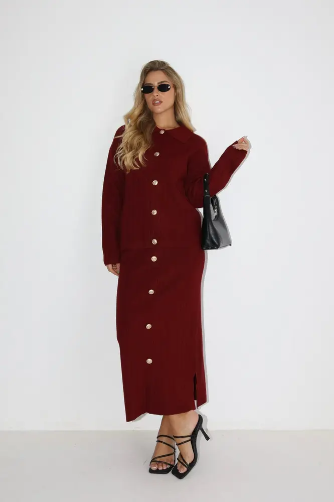 חליפת שתי חלקים מבד סריג נעים על הגוף עם כפתורי בצבע זהב בגזרה ישרה ומחמיאה לגוף