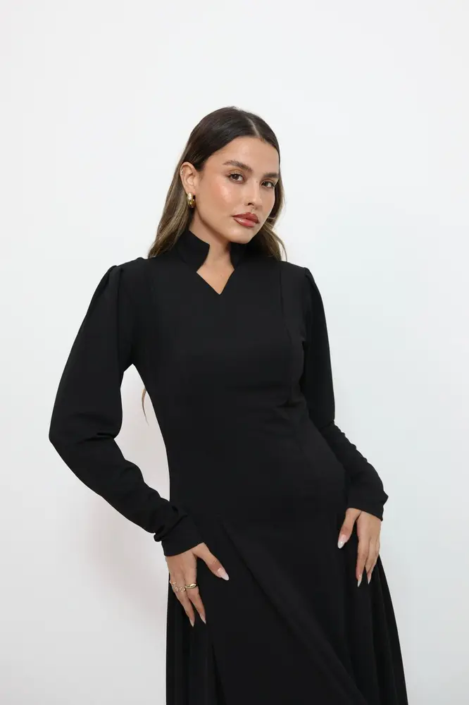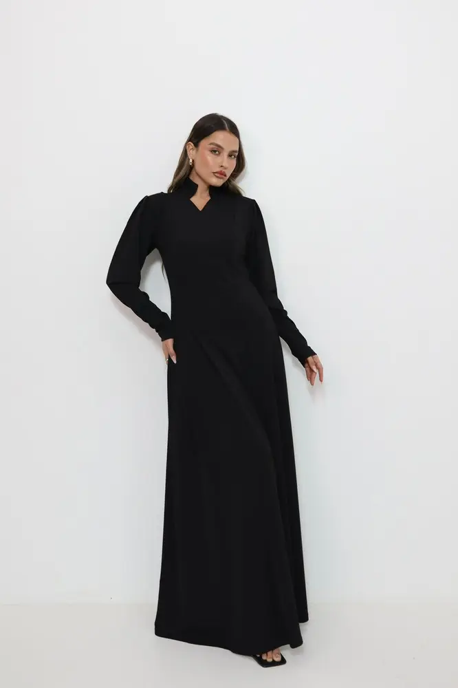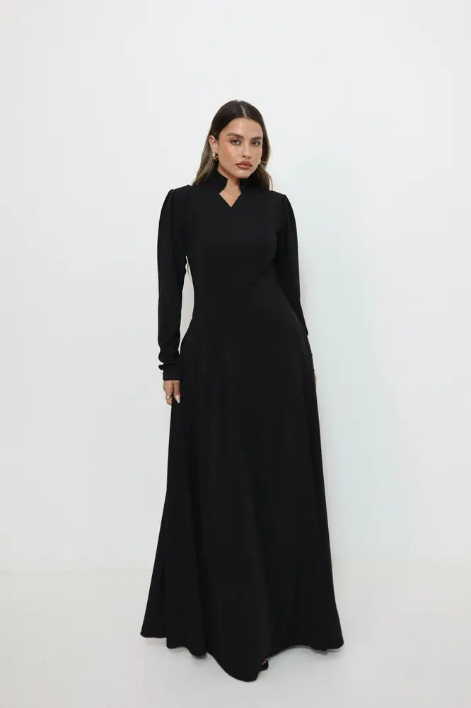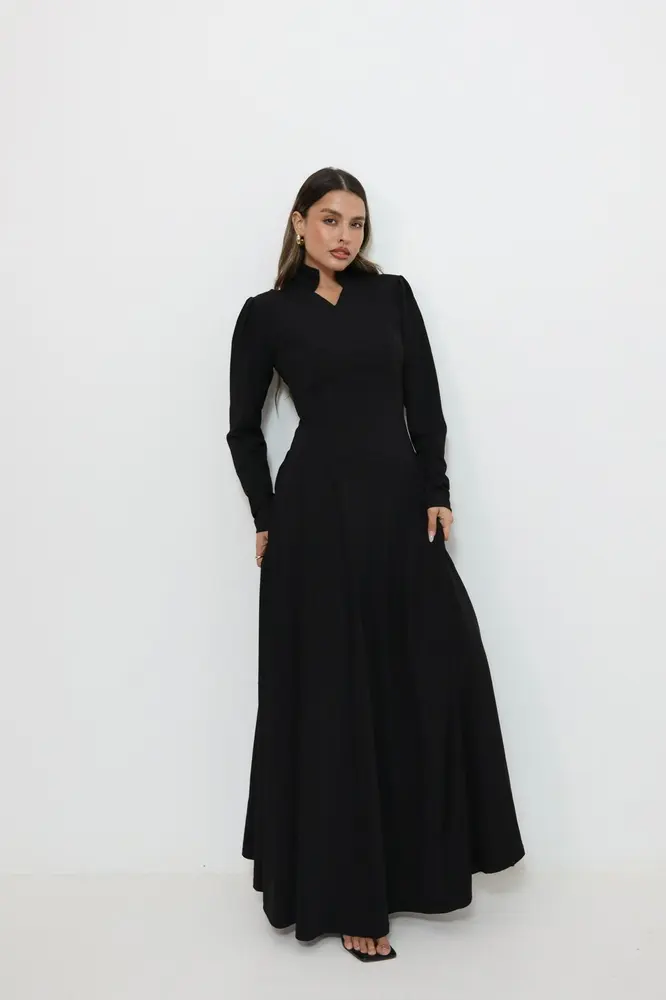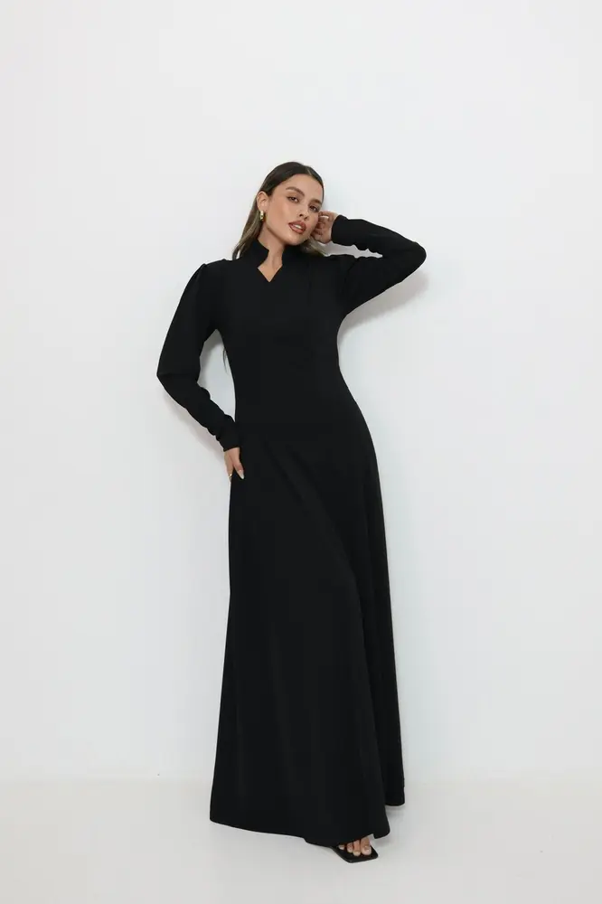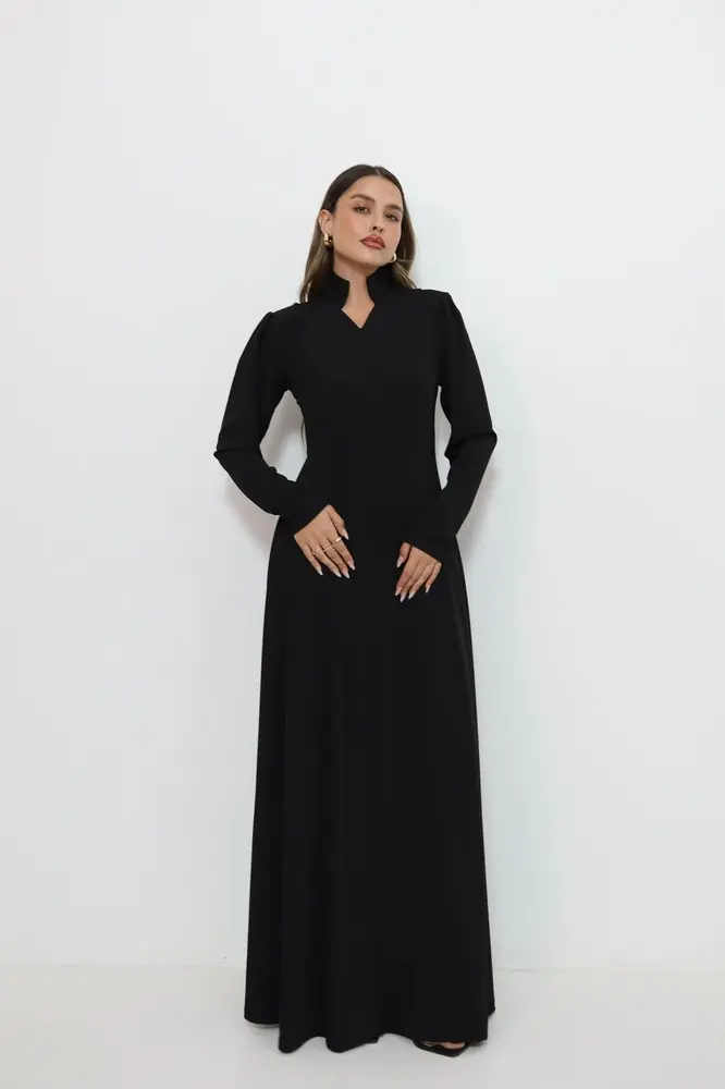 שמלת ערב צנועה בגזרה מלכותית ואצילית.עם מפתח משולש עדין וצנוע בצוואר וחצאית קלוש הורסת  . השמלה המושלמת מגיעה ב3 מידות 0/1/2 .