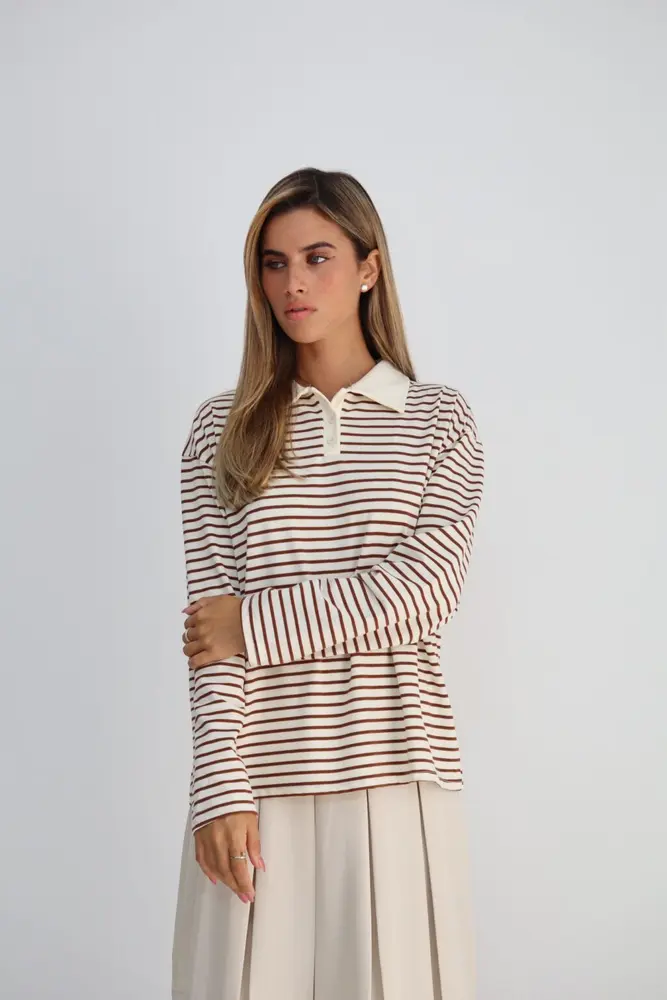 חולצת פולו עם צווארון פסים שמנת חום במידה ONE SIZE