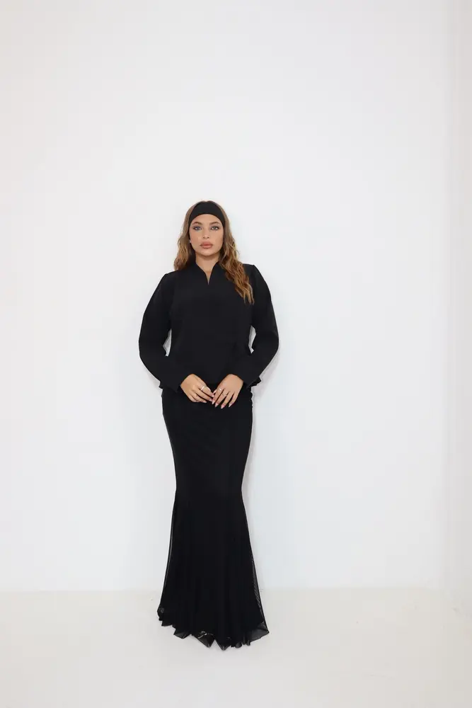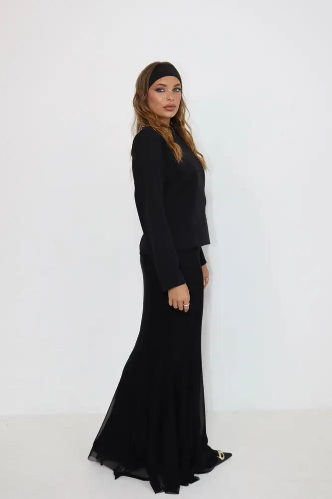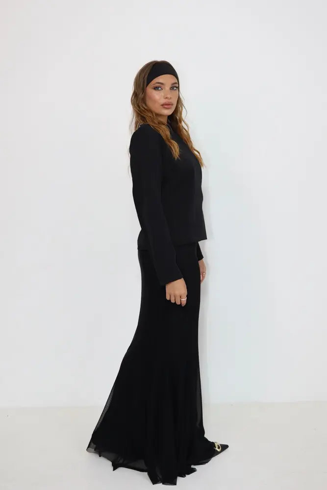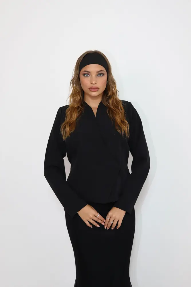 חליפת ג'קט+ חצאית תחרה אטומה למראה מחוייט ג'קט עם סגירה אלכסונית מחוייט וחצאית בגזרה ישרה מתחרה אטומה