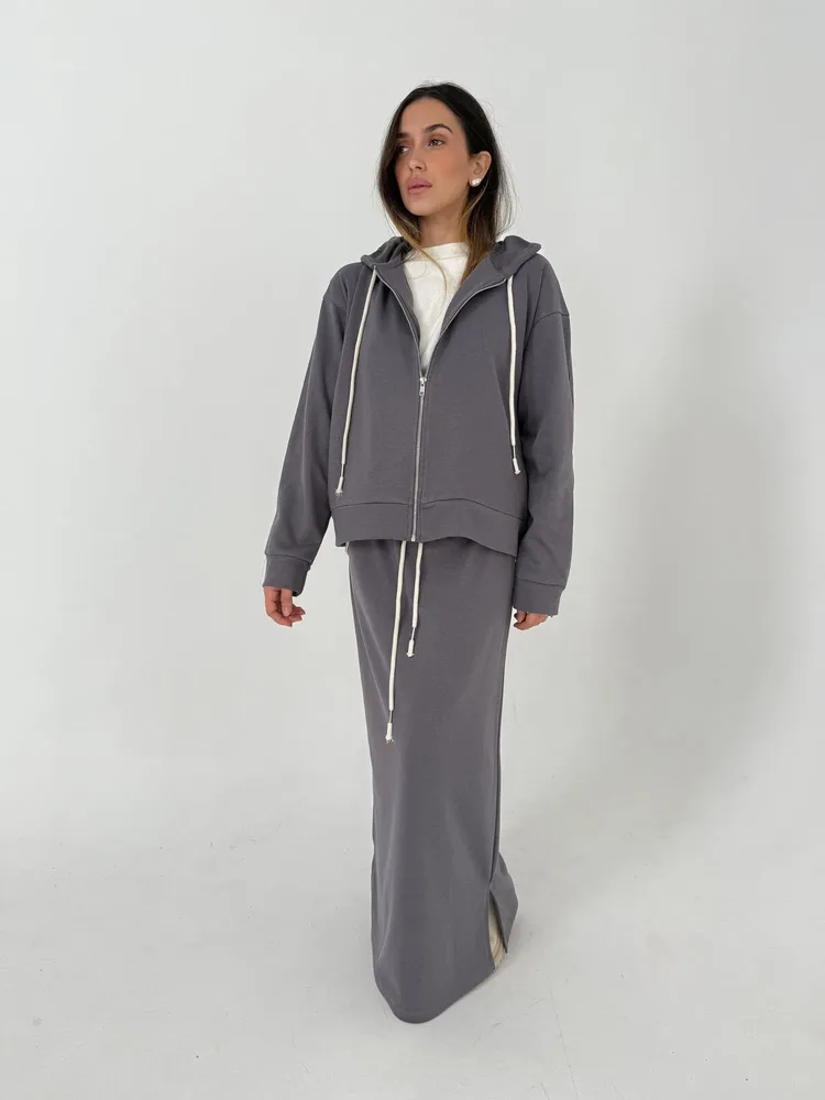 חליפת שני חלקים, מבד פרנץ טרי , ג׳קט עם רוכסן ושרוך , חצאית מקסי עם גומי . מידת הבגד על הדוגמנית 1.