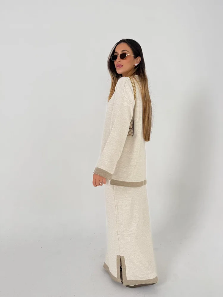 חליפת מבד סריג 2 חלקים בגזרת אוברסייז עם סימת של פס בצבע שמנת שסע צדדי  קטן בחצאית. החליפה מגיעה במידה ONE SIZE וב 4צבעים