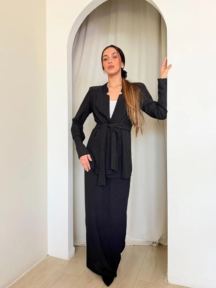 חליפת שני חלקים מבד קרפ ג׳קט עם חגורה וחצאית מקסי עם גומי למעלה.