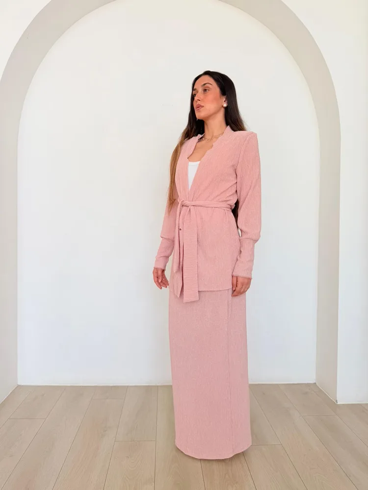 חליפת שני חלקים מבד קרפ ג׳קט עם חגורה וחצאית מקסי עם גומי למעלה.