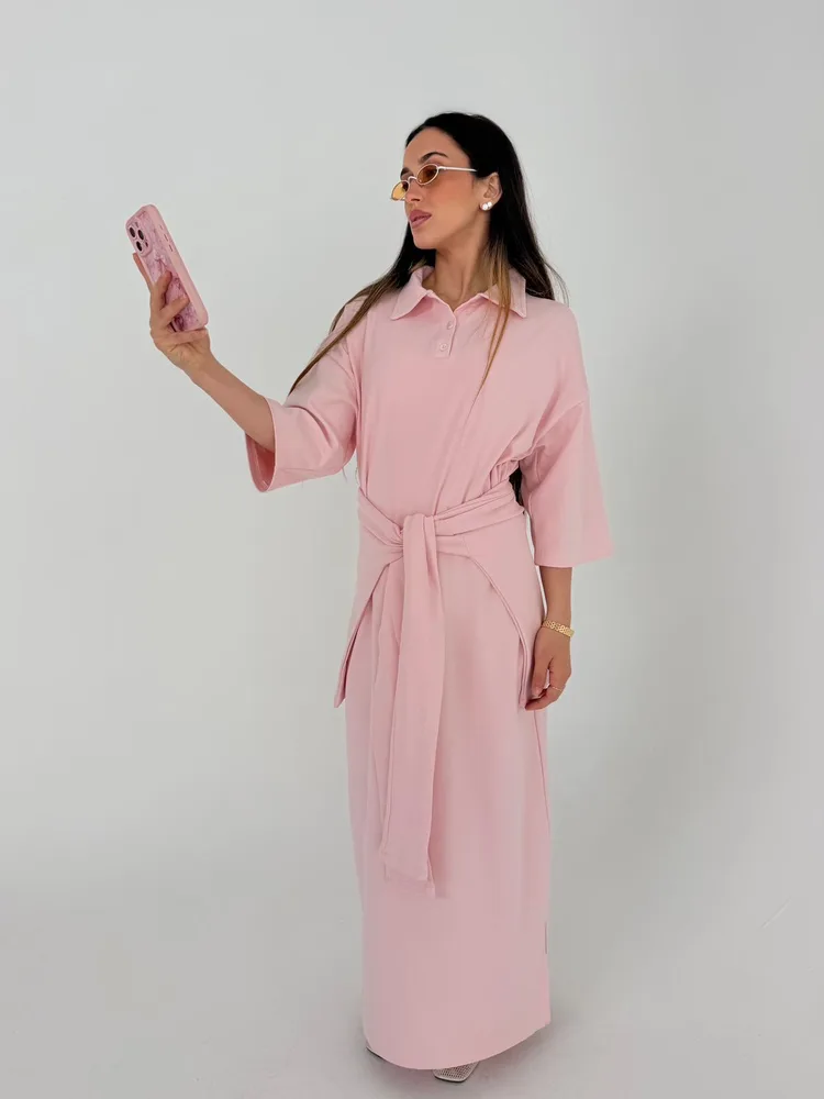 שמלת מבד כותנה עם לייקרה, שרוול 3/4 , תוספת בד לקשירה במותן למראה קז'ואל,