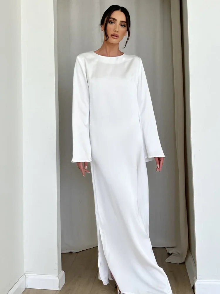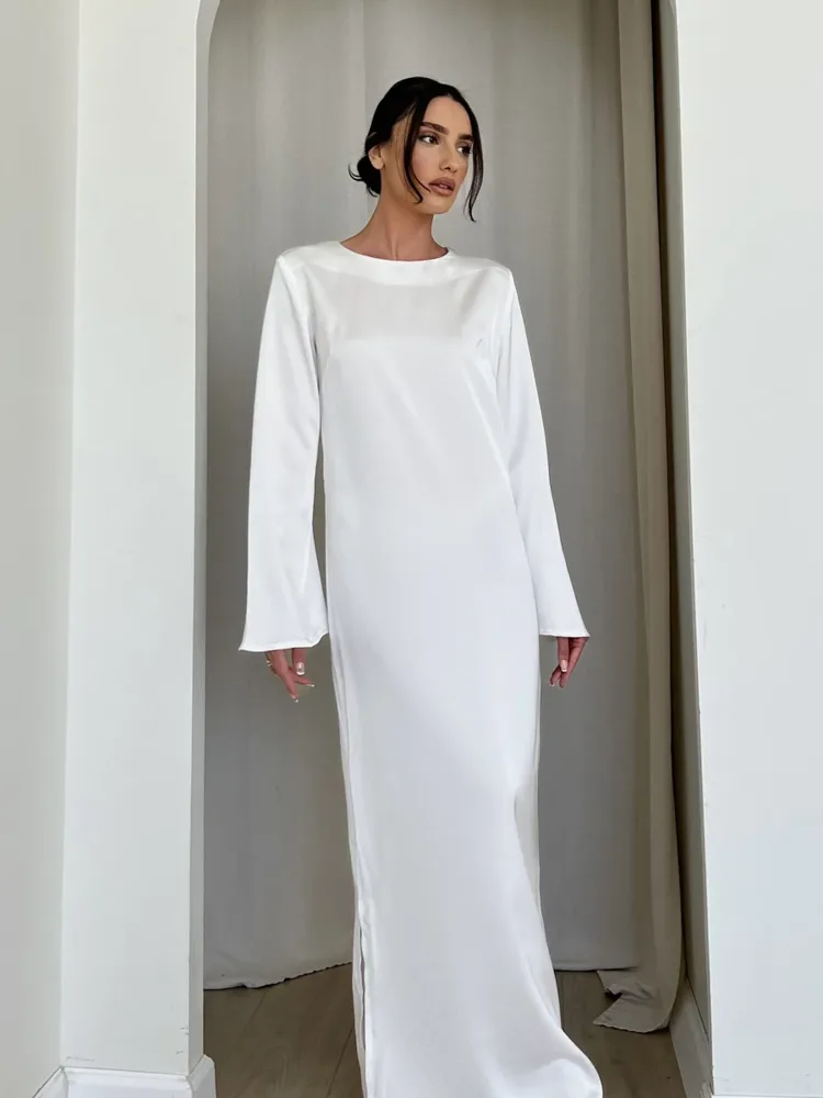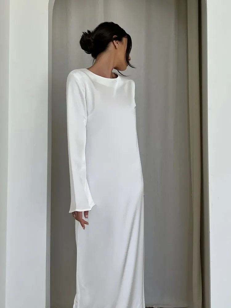 שמלת מקסי מבד משי סאטן נשפכת על הגוף, בגזרה ישרה קלאסית, שרוולים ארוכים ובסיומת מתרחב.