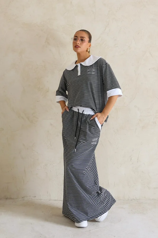 חליפת מיו מגיעה 2 חלקים חולצת 3/4 עם צווארון וחצאית מקסי גזרה ישרה עם גומי