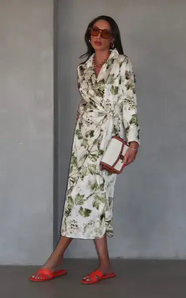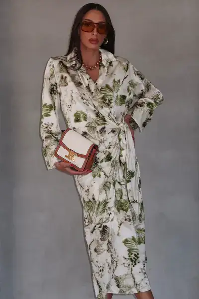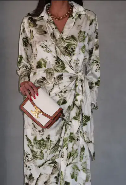 שמלת מעטפת בגזרת מידי מבד סאטן, שרוולים ארוכים וצווארון קלאסי וקשירה במותן. מתאים גם למידות גדולות