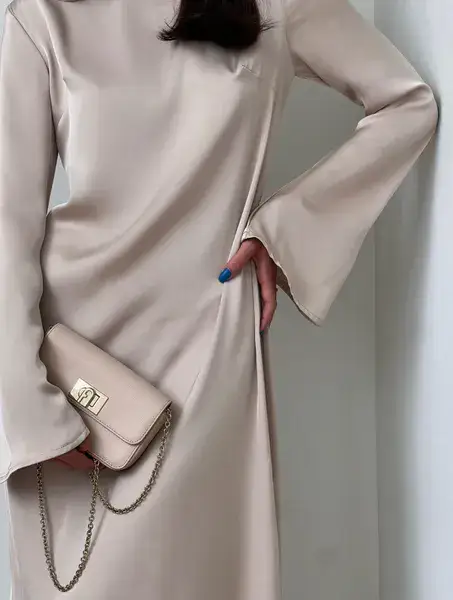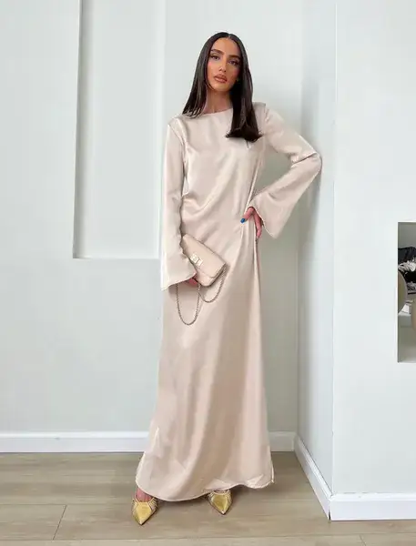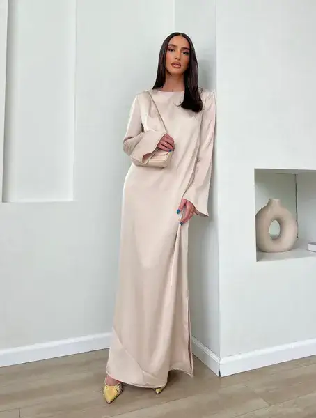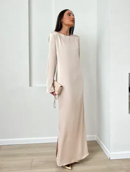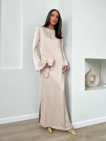 שמלת מקסי מבד משי סאטן נשפכת על הגוף, בגזרה ישרה קלאסית, שרוולים ארוכים ובסיומת מתרחב. מידת הבד על הדוגמנית 0. *מומלץ לשים תחתית*