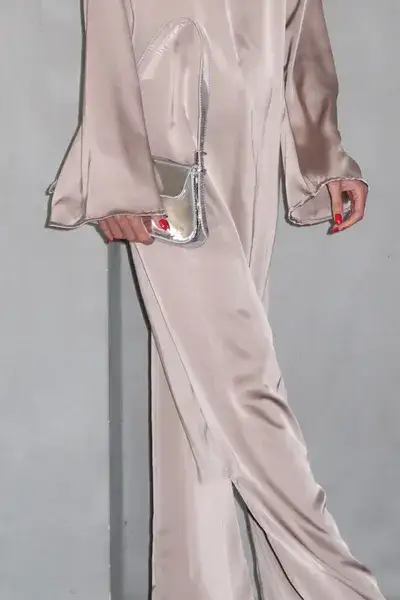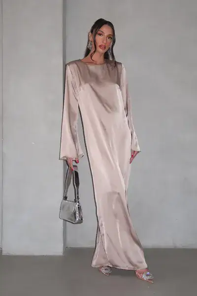 שמלת מקסי מבד משי סאטן נשפכת על הגוף, בגזרה ישרה קלאסית, שרוולים ארוכים ובסיומת מתרחב. מידת הבד על הדוגמנית 0.