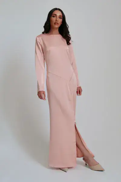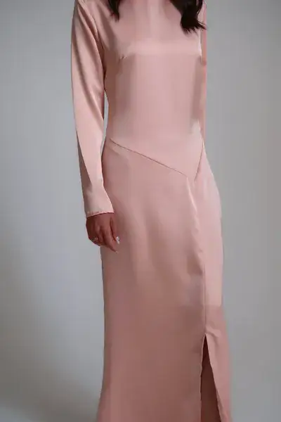 שמלת סאטן מקסי נשפכת על הגוף, שרוולים ארוכים, שסע קטן בצד ותיפורים בצורה אלכסונית. מידת הבגד על הדוגמנית 0.