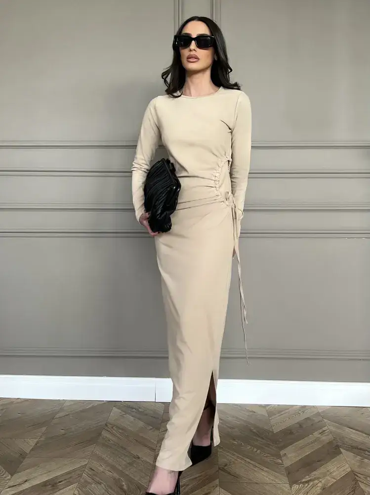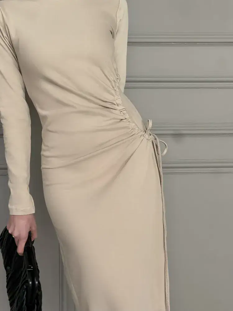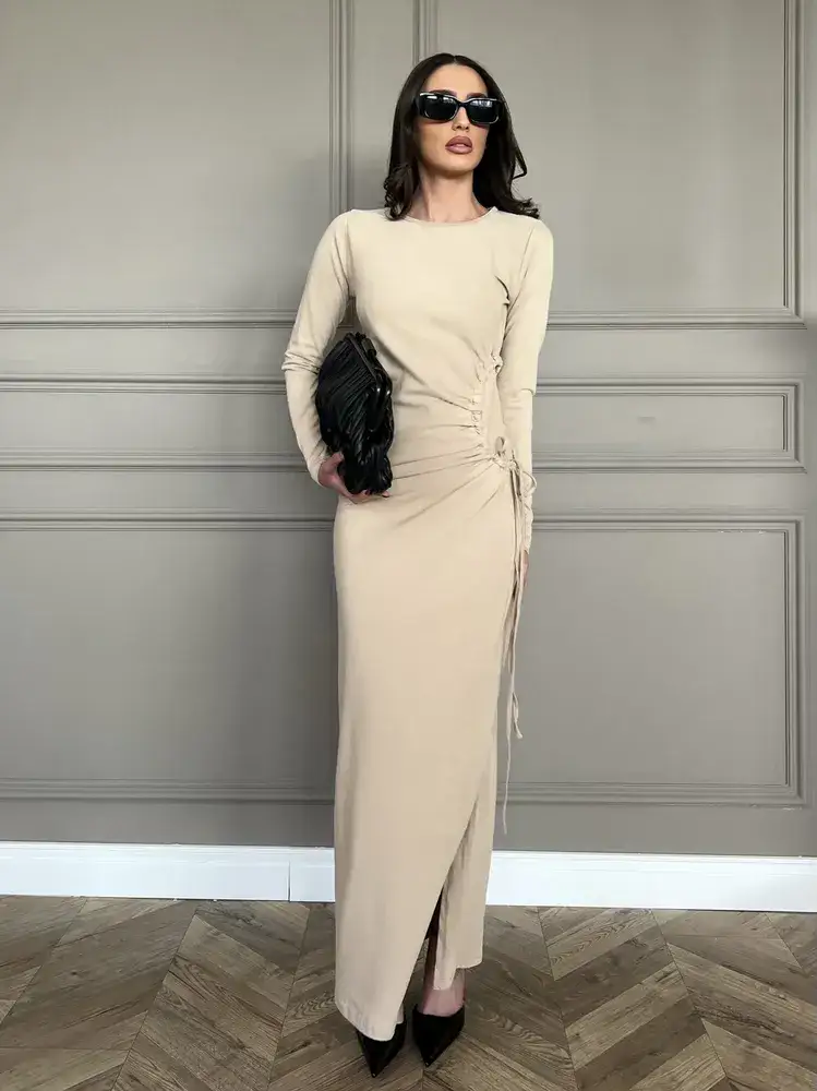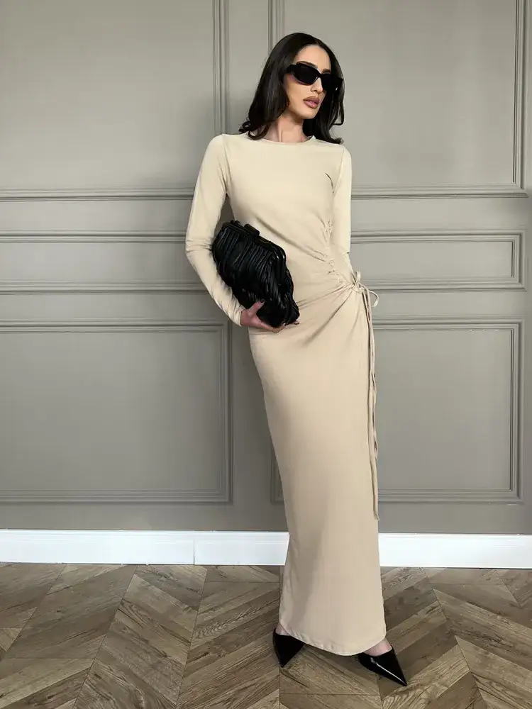 שמלת מקסי בגזרה צמודה מבד קליל, אוורירי ונעים, בצד השמלה קיים גומי בצורת עיגול  עם כיווץ למראה צר ומושלם!