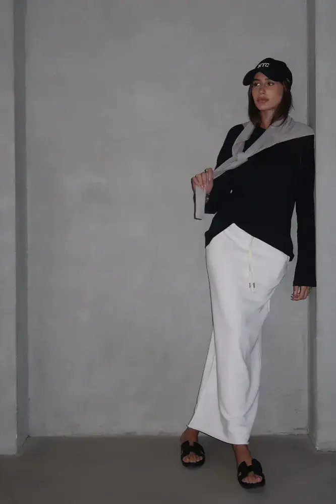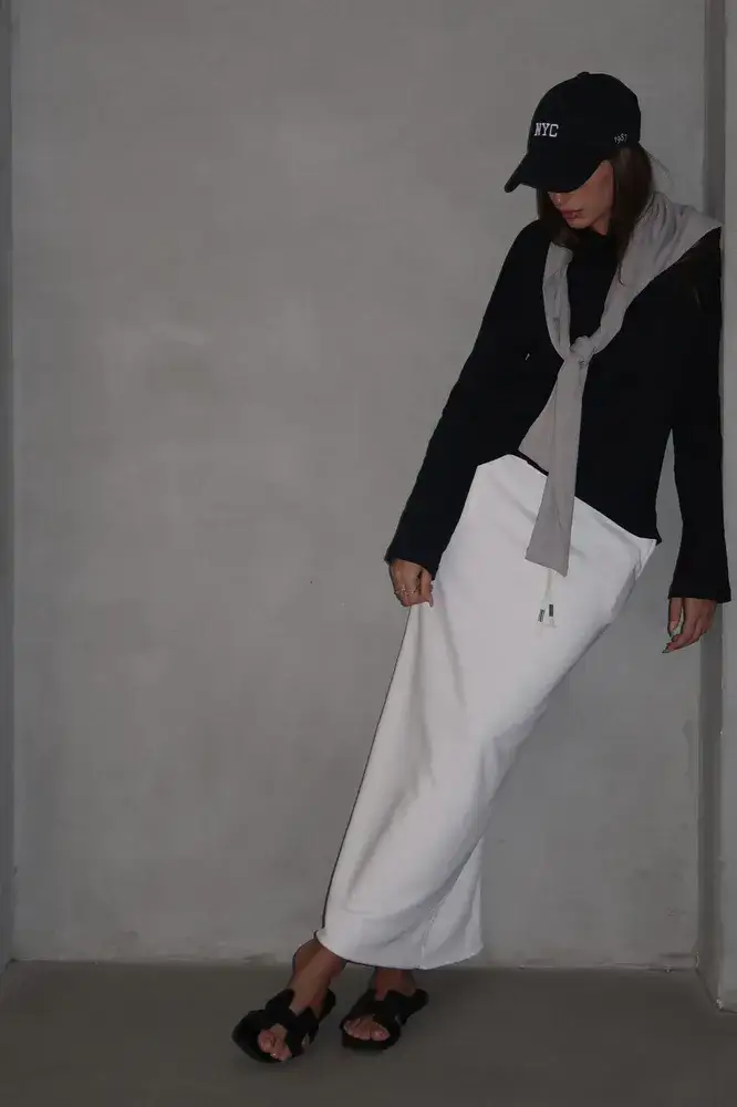 חצאית באורך מידי בייסיק עם גומי למעלה ושסע אחורי.