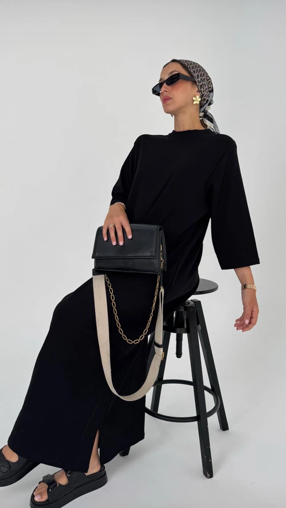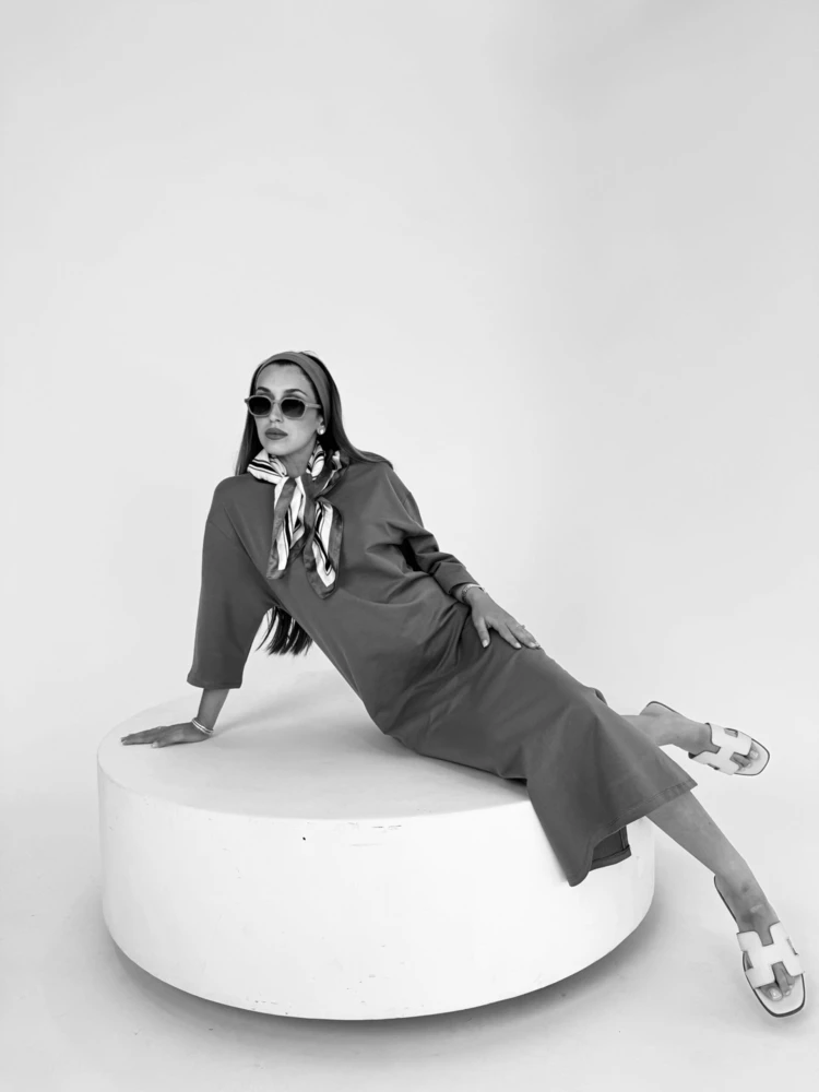 שמלה מבד פרנץ טרי בגזרת אוברסייז שרווך עובר מרפק באורך מידי מידת הדוגמנית 1