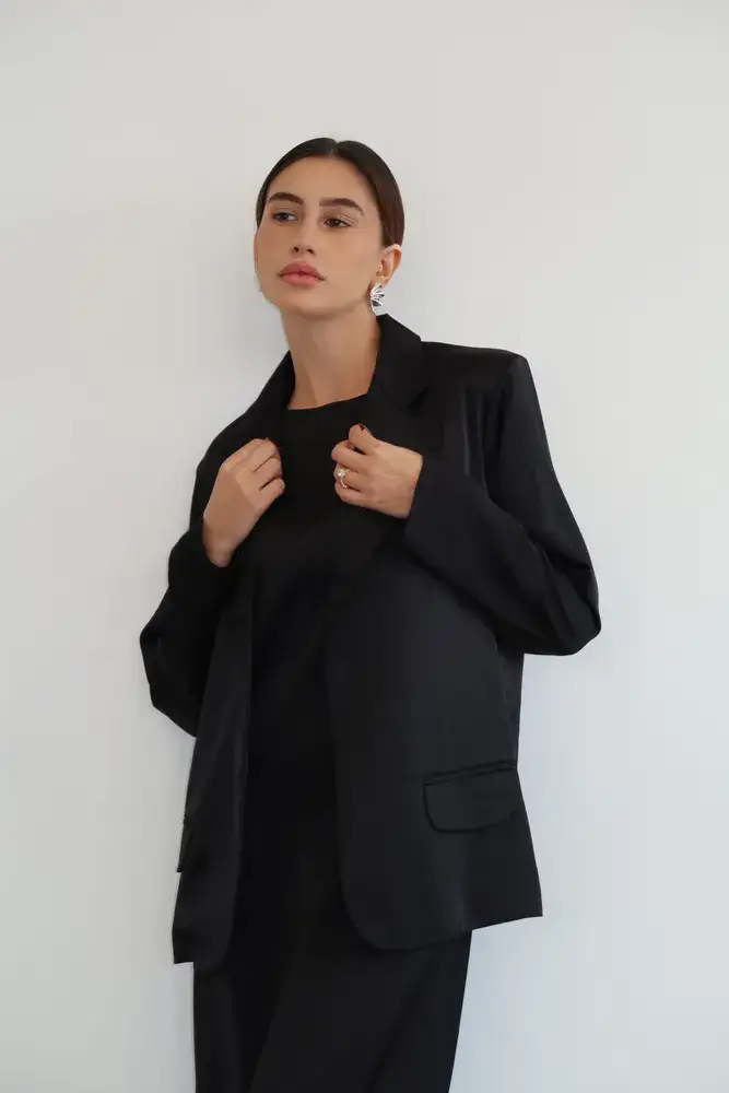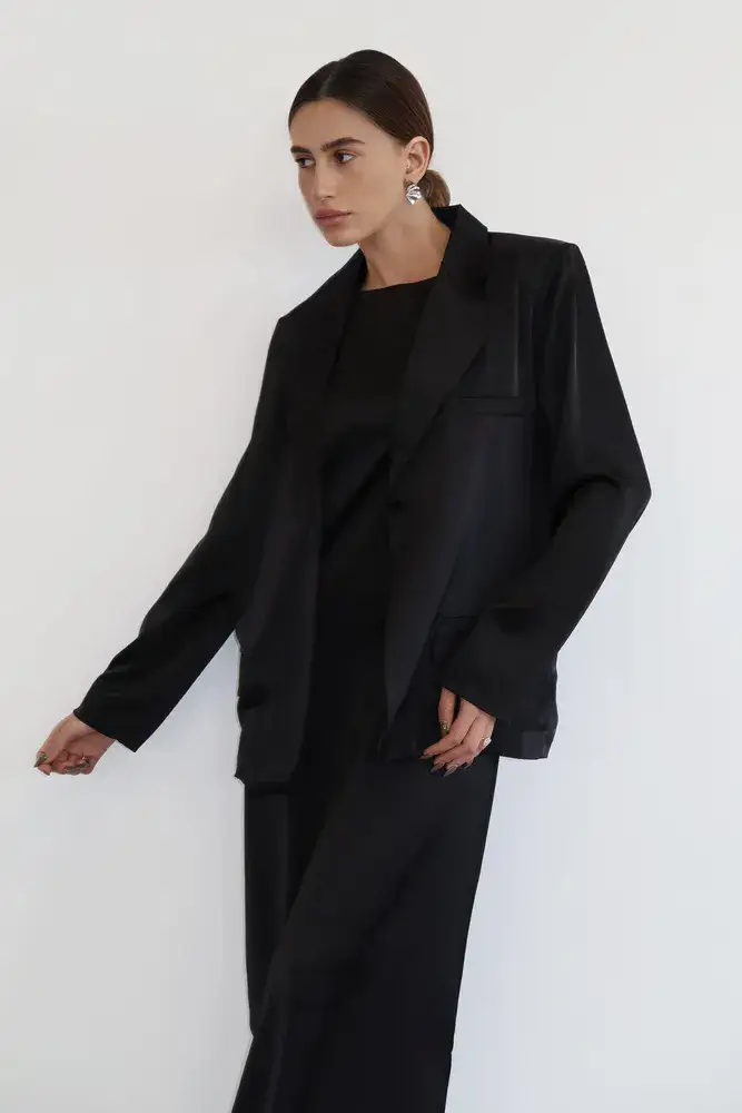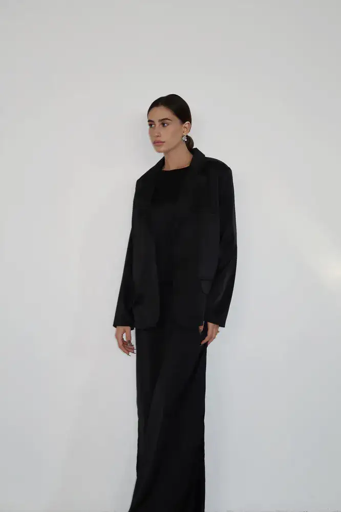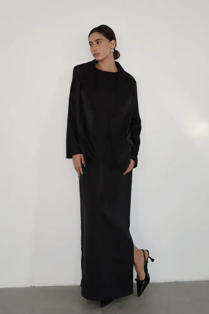 חליפת שני חלקים מבד סאטן משי, שמלת מקסי גופיה בגזרה ישרה עם שני שסעים קטנים בצידי השמלה וג׳קט בגזרת אובר סייז עם שרוולים ארוכים וכריות בכתפיים.
