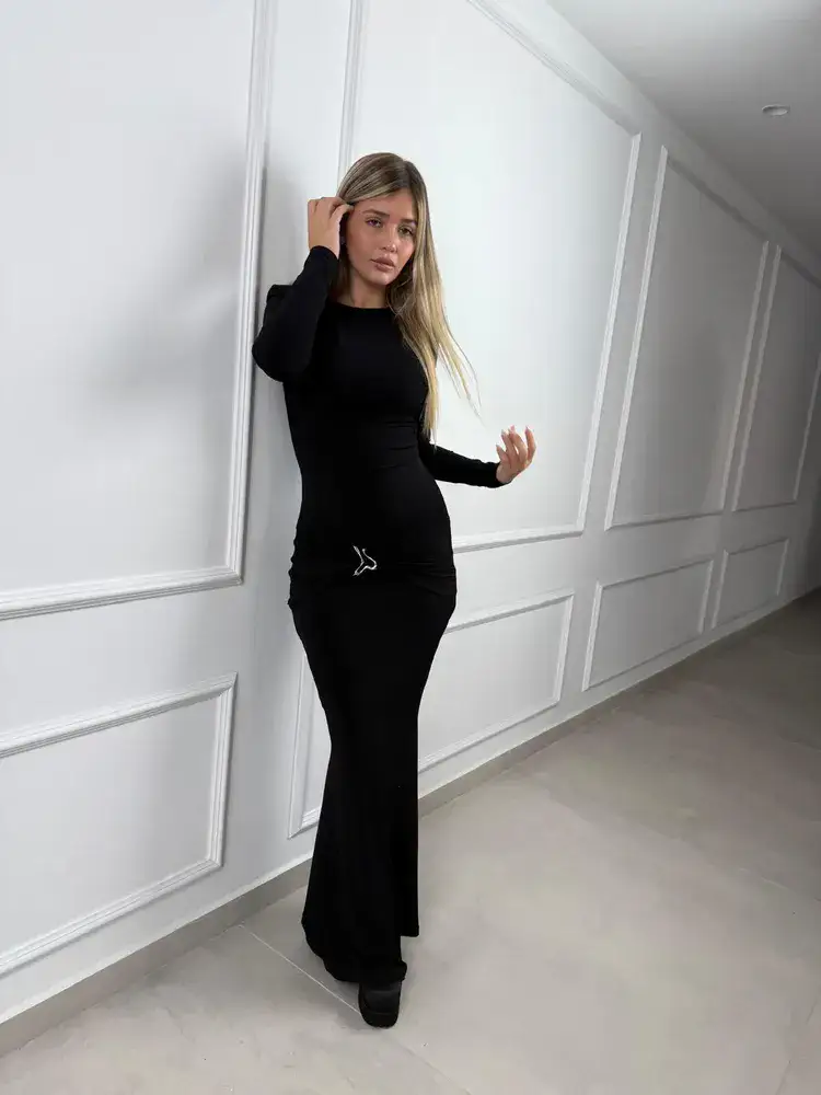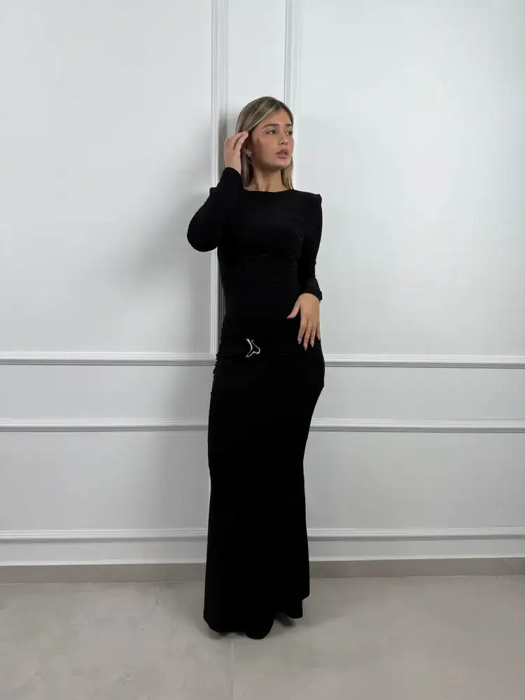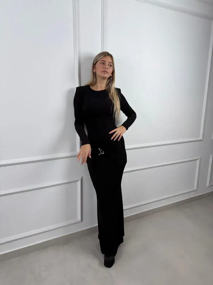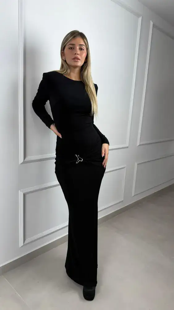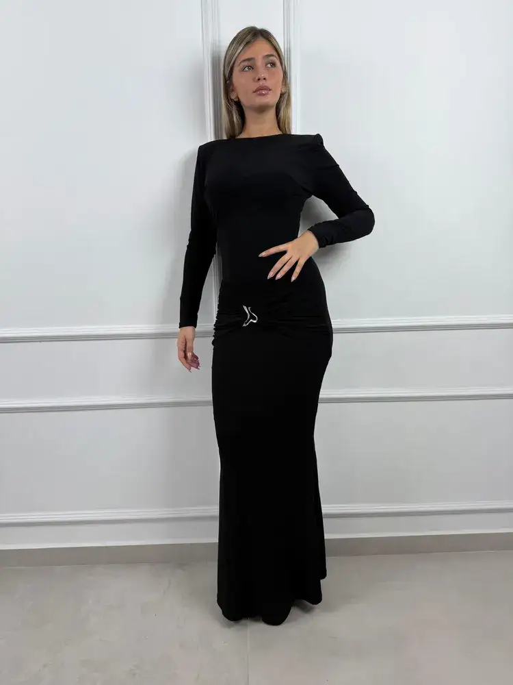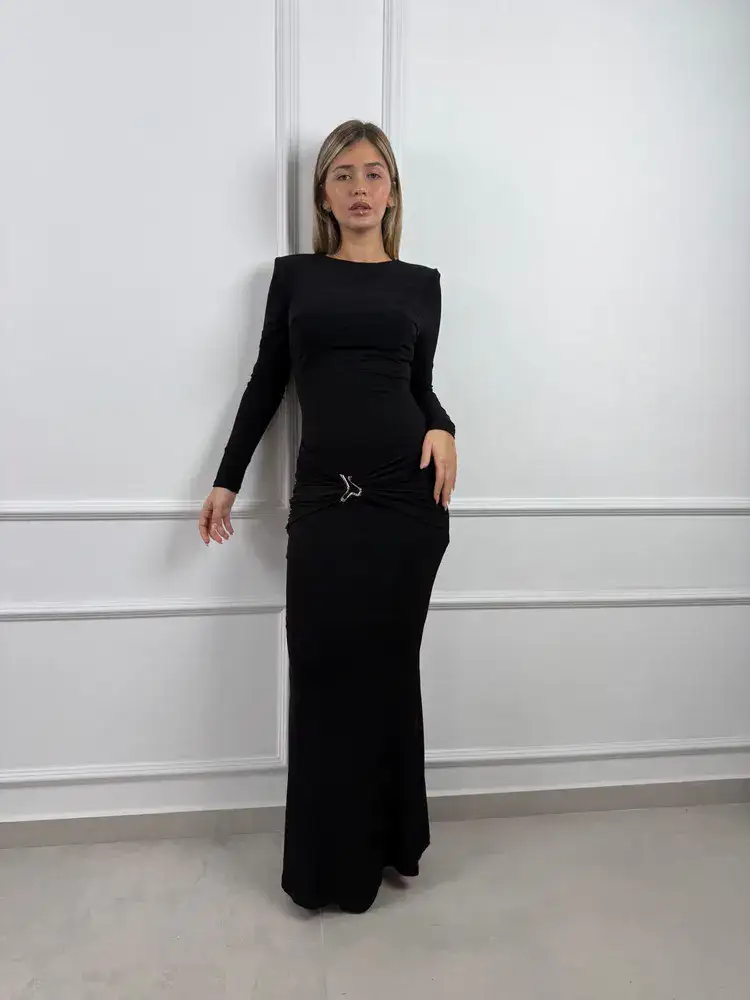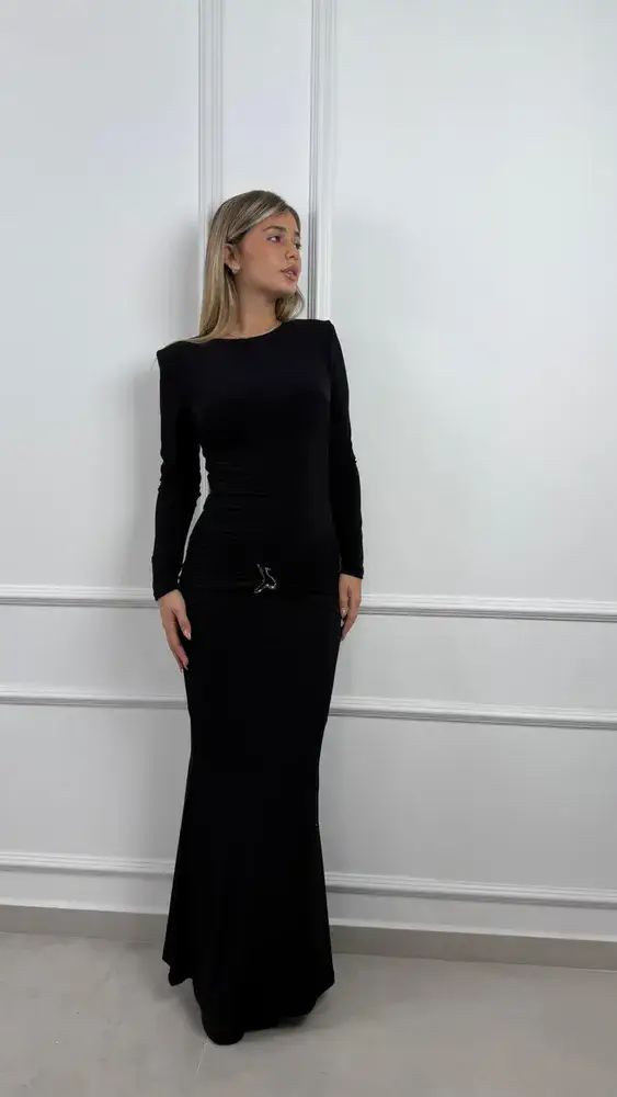 שמלת ערב בגזרה צמודה, חגורה עם כיווצים באיזור הבטן, שרוולים ארוכים עם כריות בכתפיים, כיווצים באזור המותניים למראה צר וקלאסי.