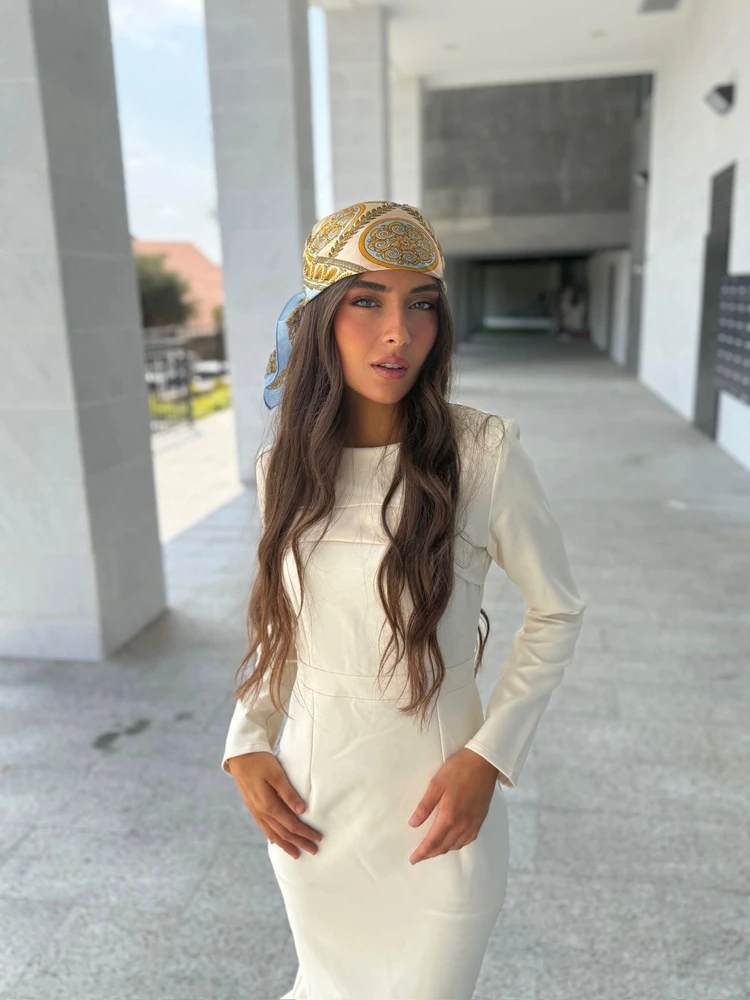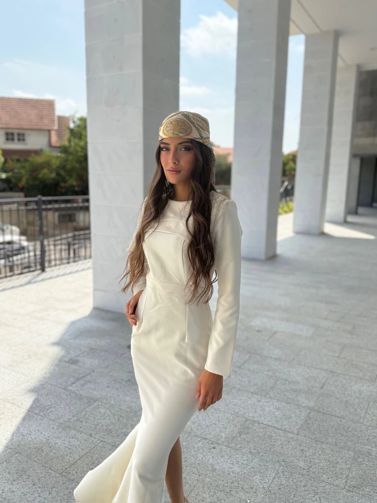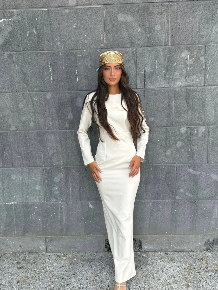 שמלת ערב מבד מחויט, שרוולים ארוכים , דמוי מחוך באזור החזה ופפיון לדוגמא באיזור המותן  למראה קלאסי נקי ומוקפד מידת הבגד על הדוגמנית 1.