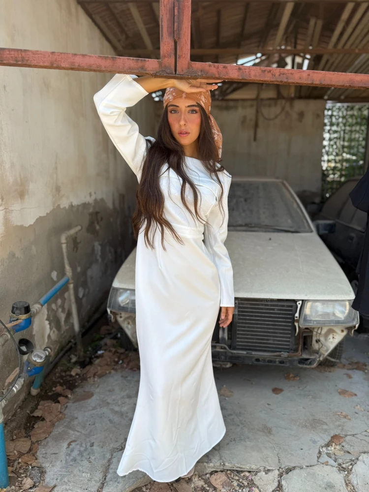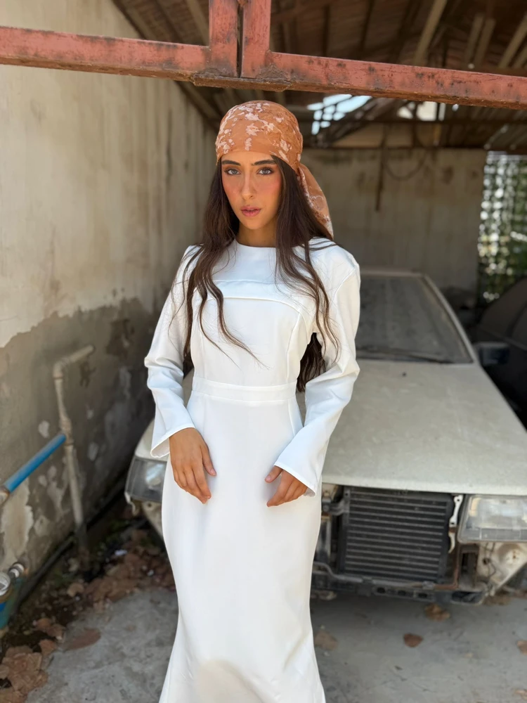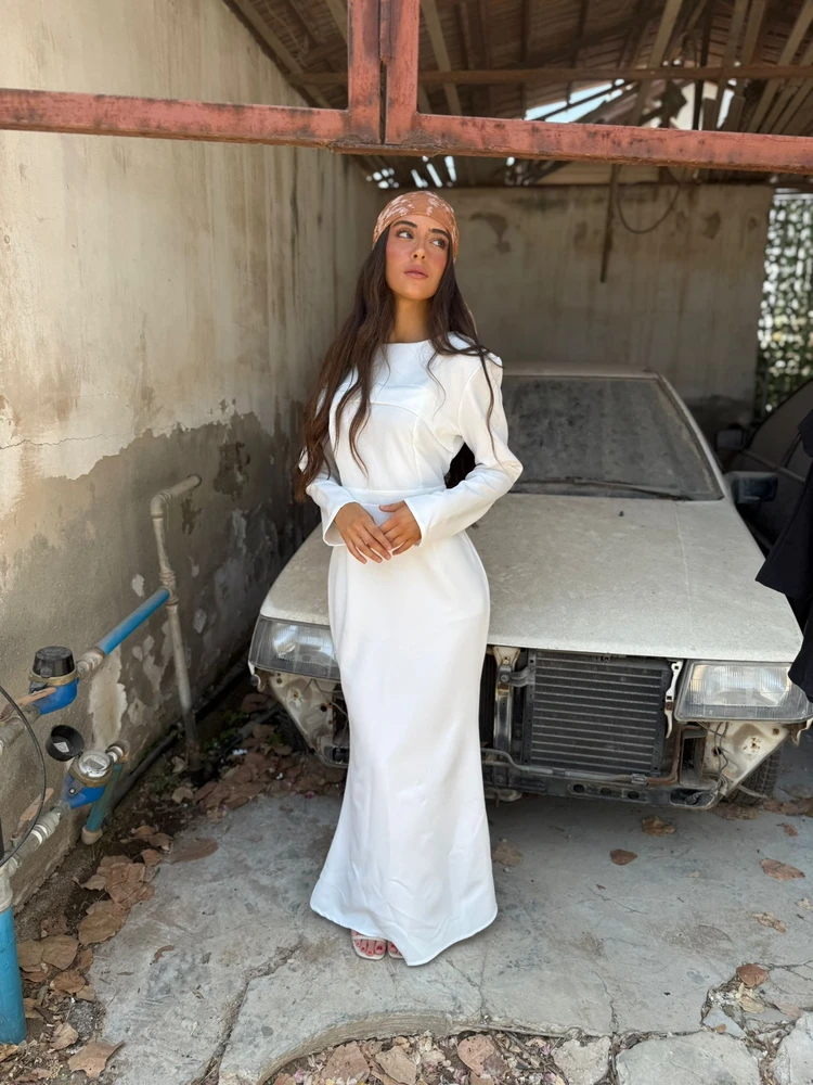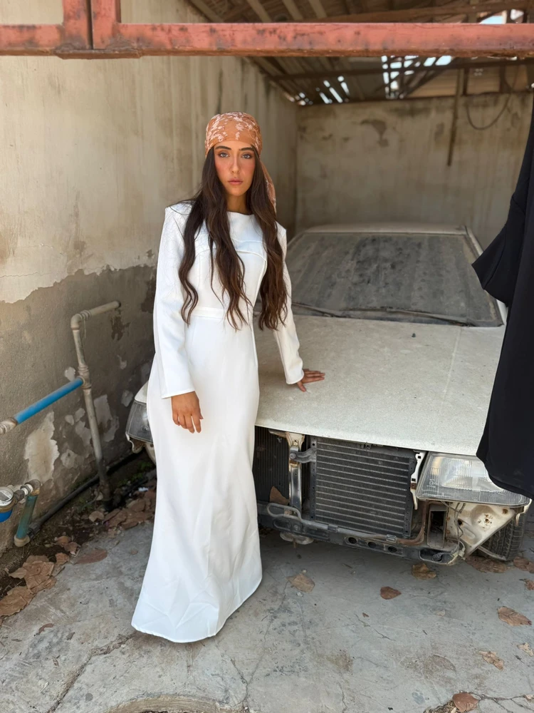 שמלת ערב מבד מחויט, שרוולים ארוכים , דמוי מחוך באזור החזה למראה קלאסי נקי ומוקפד מידת הבגד על הדוגמנית 0.
