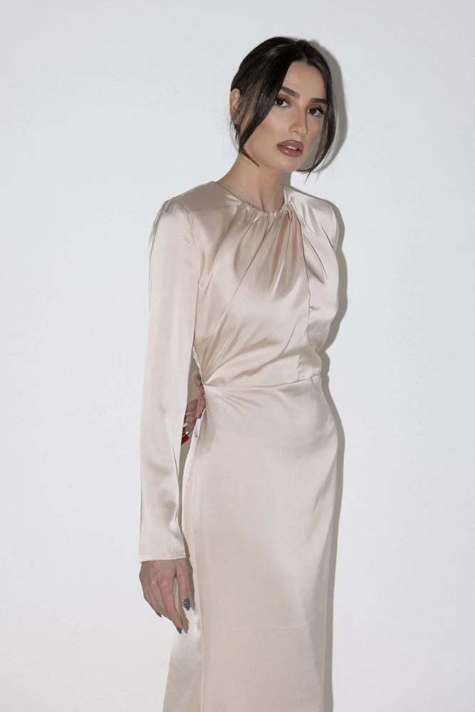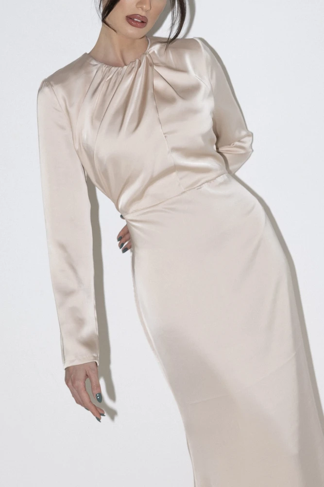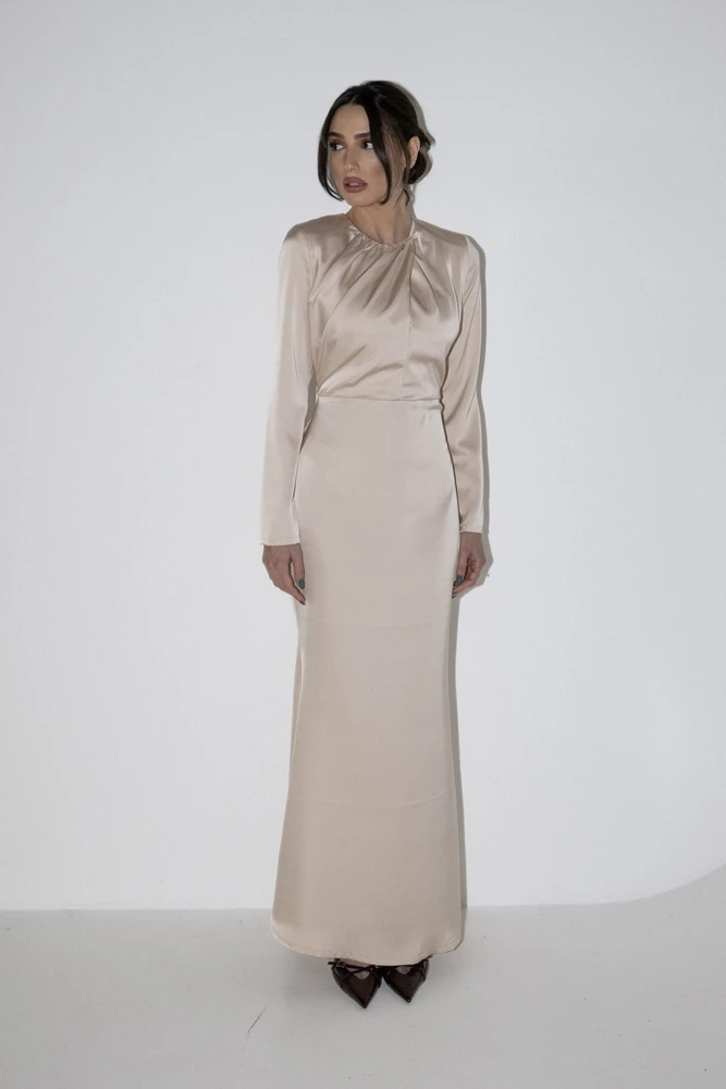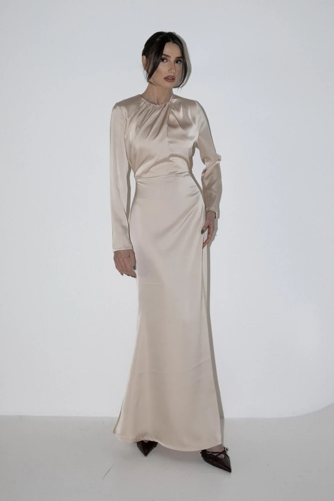 שמלת מקסי מבד סאטן נשפכת על הגוף, שרוולים ארוכים ורוכסן אחורי.