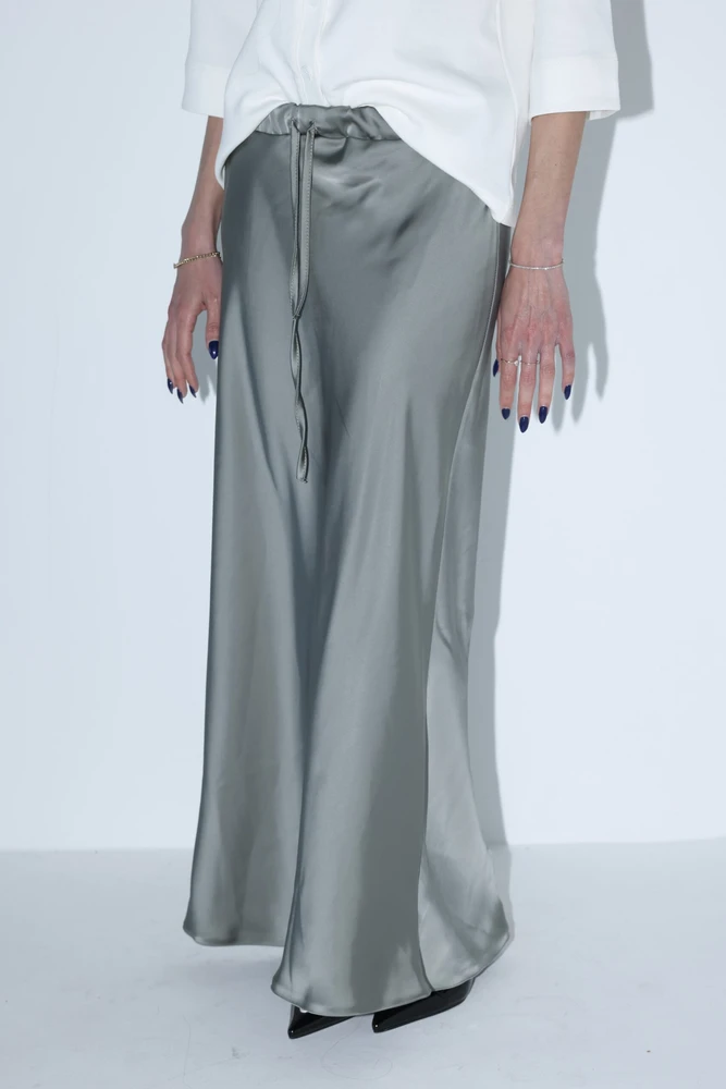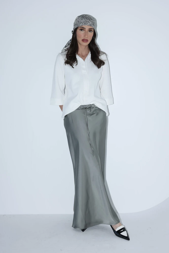 חצאית מושלמת מבד סאטן משי נשפכת על הגוף למראה קלאסי ומדהים וגומי במותן.