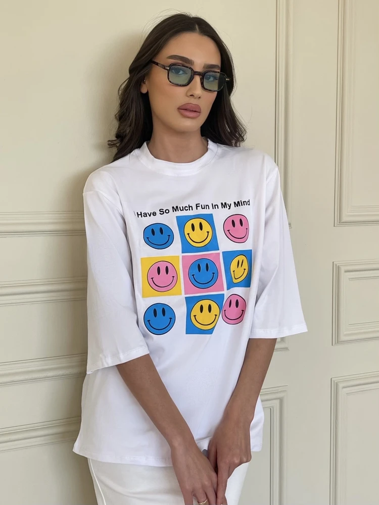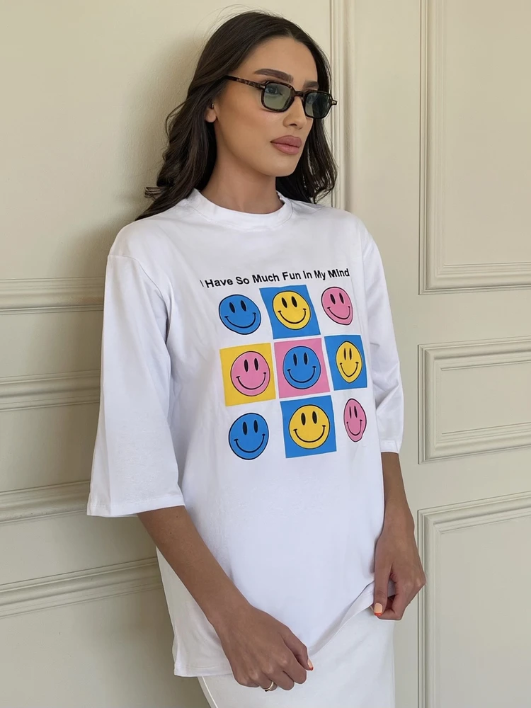 טי שרט בגזרת אובר סייז, שרוול 3/4 והדפס סמיילי.