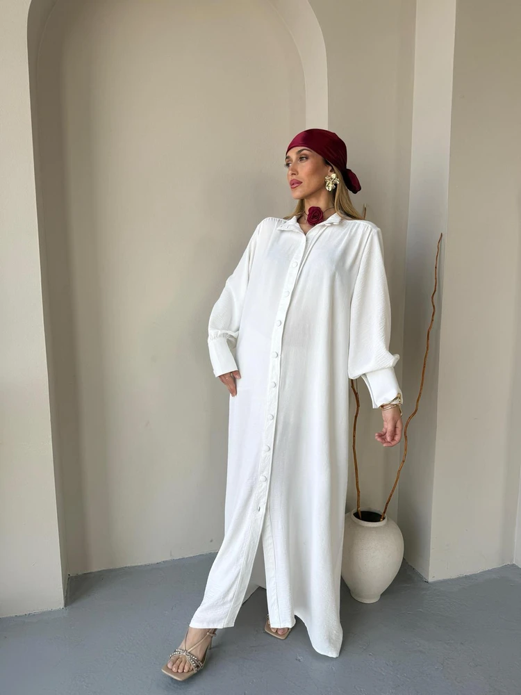 שמלה נשפכת בגזרה רחבה מקסי , כפתורים לאורך השמלה, שרוולים ארוכים .