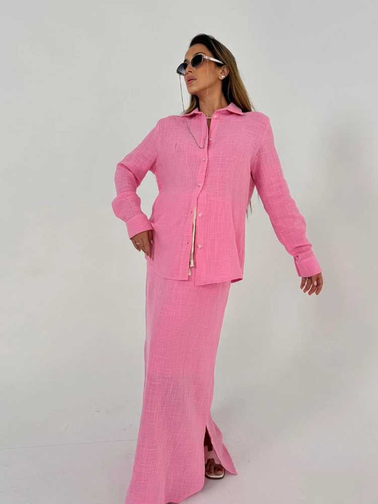 חליפת מבד טטרא חצאית בגזרת מקסי ישרה עם גומי וחולצה מכופתרת עם צווארון