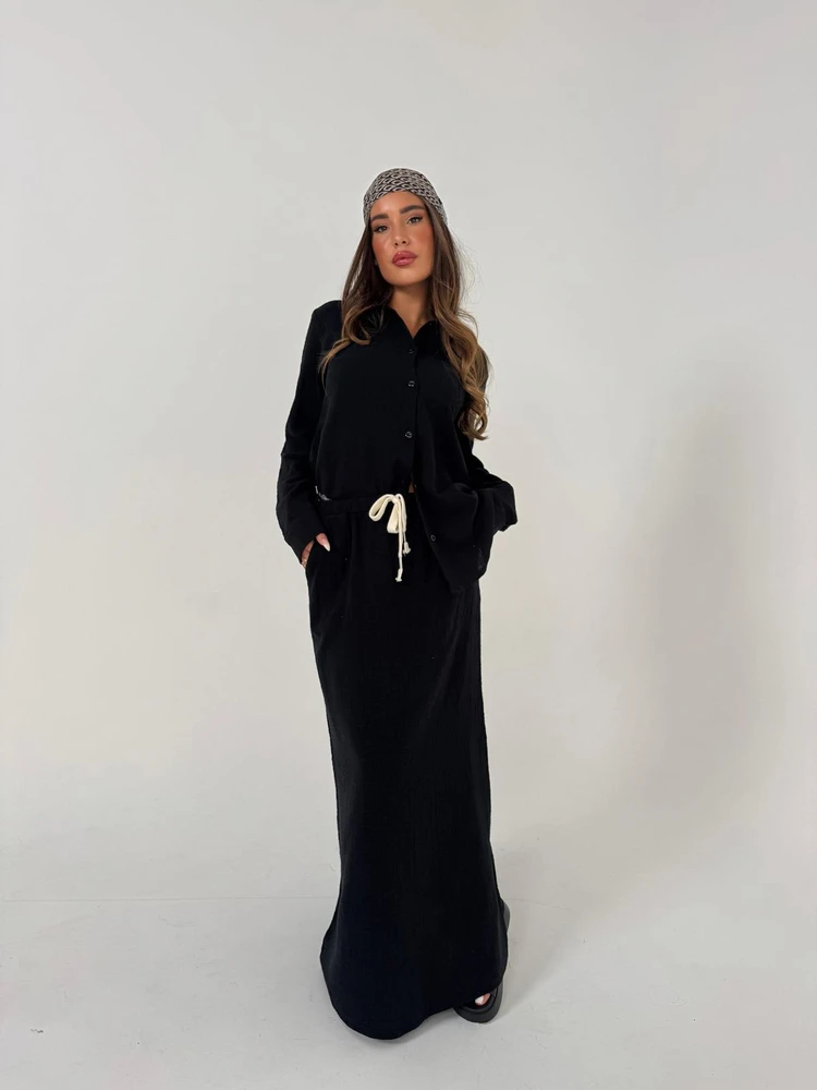 חליפת מבד טטרא חצאית בגזרת מקסי ישרה עם גומי וחולצה מכופתרת עם צווארון