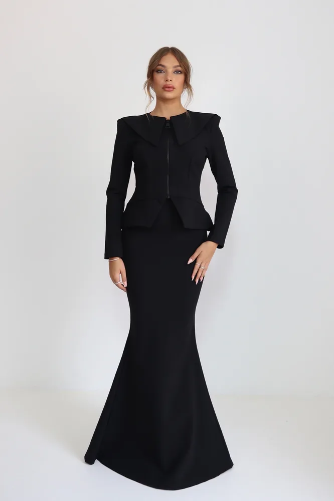 חליפה מבד מחויט עומד מחטב על הגוף חצאית באורך מקסי עם ג'קט בסגנון מחוך מגיעה ב3 מידות SML