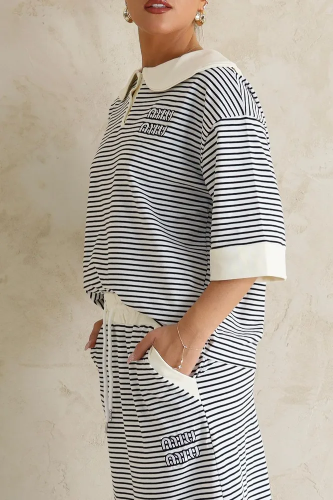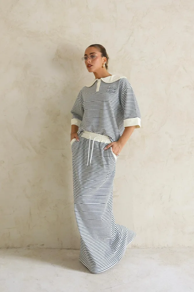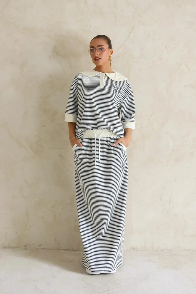 חליפת מיו מגיעה 2 חלקים חולצת 3/4 עם צווארון וחצאית מקסי גזרה ישרה עם גומי