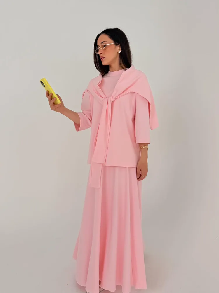 חליפת בייסיק מגיעה ב3 חלקים חצאית גזרה A חולצה 3/4 ותוספת קשירה שניתנת להורדה