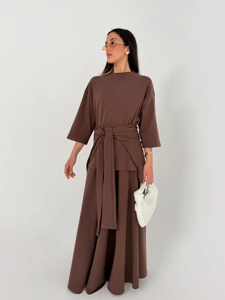 חליפת בייסיק מגיעה ב3 חלקים חצאית גזרה A חולצה 3/4 ותוספת קשירה שניתנת להורדה